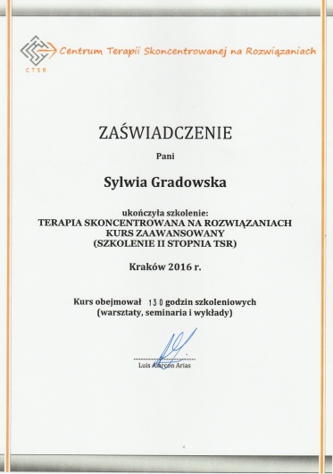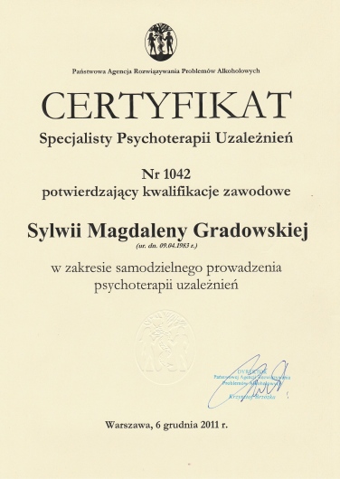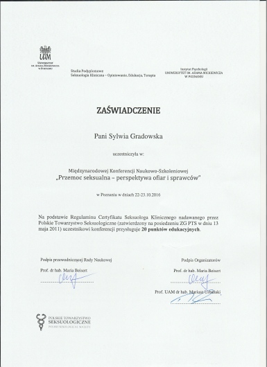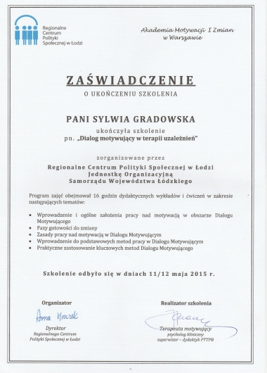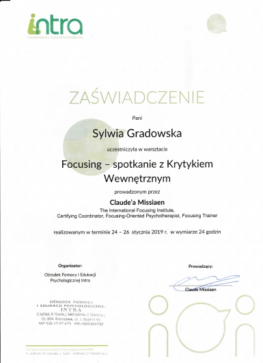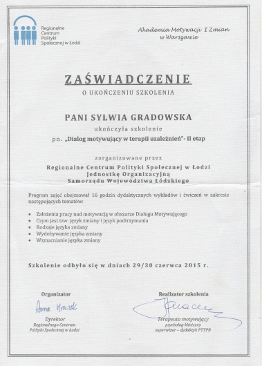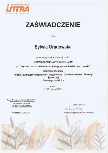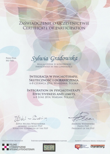 Stale podnoszę swoje kwalifikacje, biorąc udział w szkoleniach i konferencjach, m.in. w roku 2015 szkolenie w zakresie Dialogu Motywującego; w 2016r szkolenie w zakresie Terapii Skoncentrowanej na Rozwiązaniach (CTSR), konferencja "Przemoc seksualna - perspektywa ofiar i sprawców"; w 2018r Kongres Suicydologiczny oraz szkolenie "Dialog motywujący i terapia poznawczo-behawioralna..."; w 2019r "Focusing - spotkanie z Krytykiem Wewnętrznym"; w 2020r "Focusing w pracy z krainą snów", "EFT - Terapia Skoncentrowana na Emocjach"; 2022r "Focusing. Tworzenie znaczeń i wzrost posttraumatyczny"; 2023r "Wprowadzenie do terapii zorientowanej focusingowo", 2024r "Praca ze wstydem i złością w psychoterapii EFT", 2025r "O terapii ADHD w nurcie humanistyczno-doświadczeniowym".