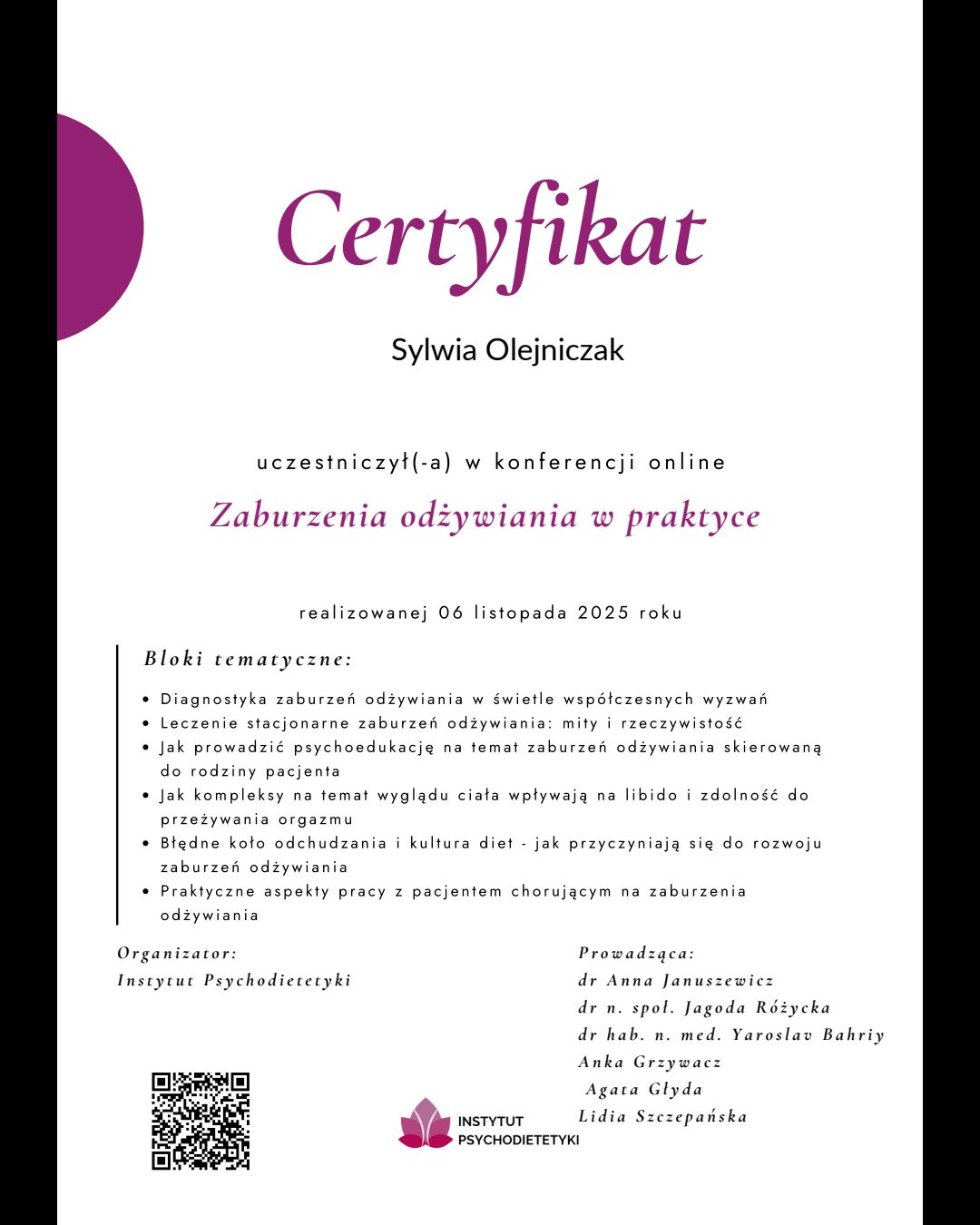 nazywam się Sylwia Olejniczak jestem psycholożką i psychodietetyczką. Pracuję w obszarze pomagania psychologicznego , prowadząc gabinet z myślą o osobach  doświadczających kryzysów w relacjach, kłopotów z samooceną i samoakceptacją. Tworzę przestrzeń, w której możesz poczuć się swobodnie, bez oceniania i presji.