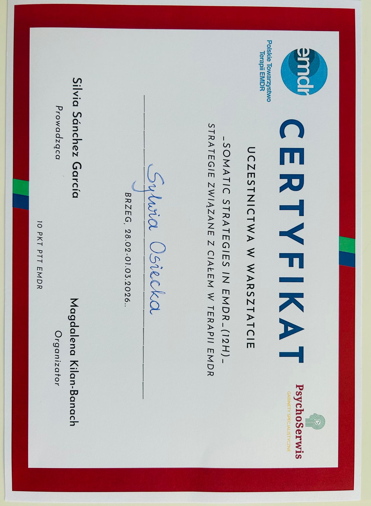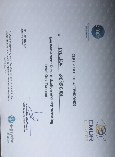 -EMDR - Certyfikat EMDR, poziom 1 oraz poziom 2, prowadząca Dr Anabel Gonzalez, organizator E-psyche. Członkini Polskiego Towarzystwa Terapii EMDR