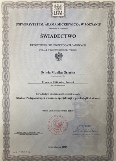 - Uniwersytet im. Adama Mickiewicza w Poznaniu- ukończone 4-letnie kształcenie podyplomowe specjalizacyjne z psychologii klinicznej