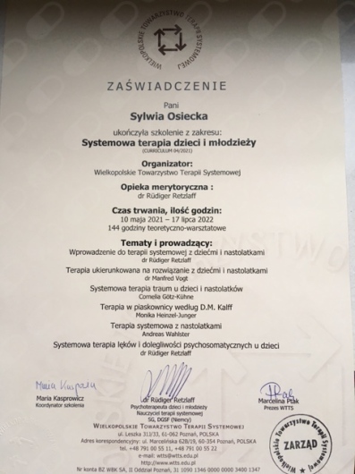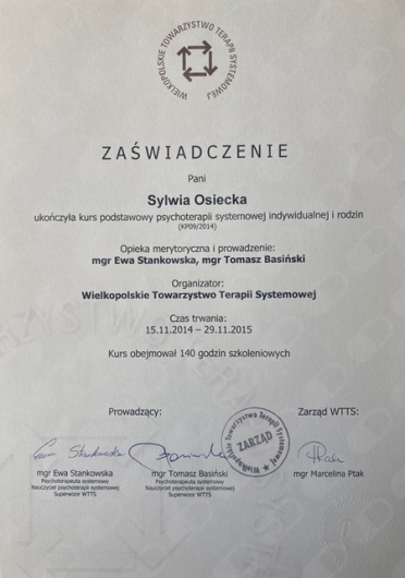 - Wielkopolskie Towarzystwo Terapii Systemowej - w procesie certyfikacji (Certyfikat Psychoterapeuty Systemowego WTTS zgodny z wymogami Ministra Zdrowia), na etapie ukończonego całościowego szkolenia wynoszącego ponad 1600 godzin dydaktycznych, stażu klinicznego