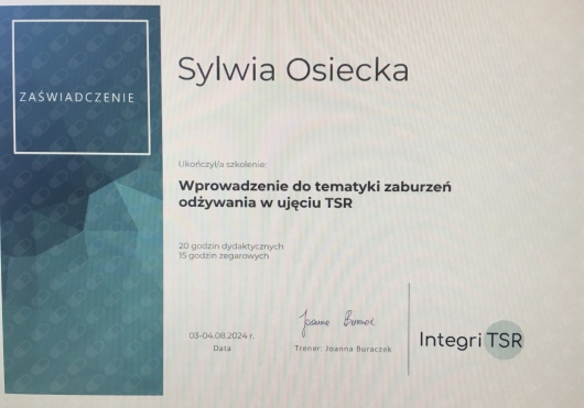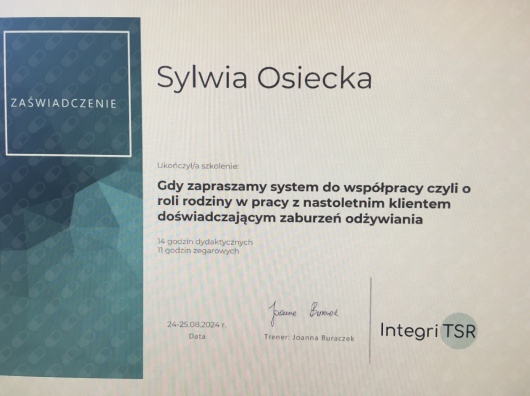 - Cykl Szkoleń ,,Praca z Klientem zmagającym się z zaburzeniami odżywiania w ujęciu Terapii Skoncentrowanej na Rozwiązaniu": część I: ,,Wprowadzenie do tematyki zaburzeń odżywania w ujęciu TSR" oraz część II „Gdy zapraszamy system do współpracy”, Integri