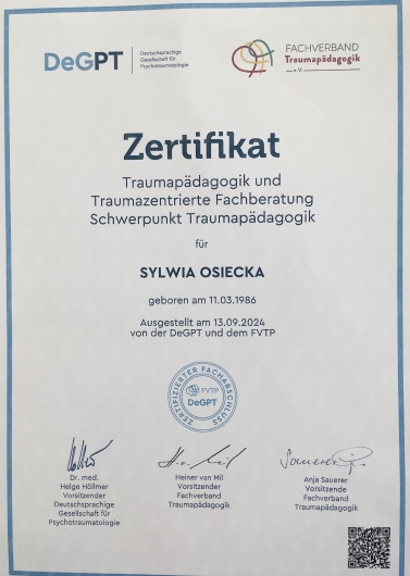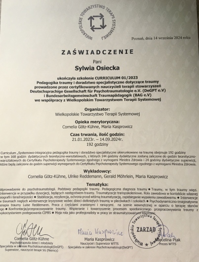 - Wielkopolskie Towarzystwo Terapii Systemowej- ukończone 1,5 roczne szkolenie ,,Systemowo-integracyjna pedagogika traumy i doradztwo specjalistyczne ukierunkowane na traumę" realizowane w oparciu o wytyczne Niemieckiego Towarzystwa Psychotraumatologii / Stowarzyszenia Specjalistycznego Pedagogiki Traumy Deutschsprachige Gesellschaft für Psychotraumatologie (DeGPT) / Fachverband Traumapädagogik (dawniej BAG e.V), uprawnienia Specjalisty w zakresie Psychotraumatologii (DeGPT)