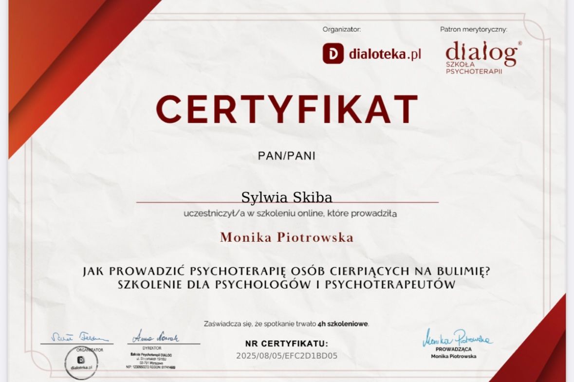Czy Sylwia Skiba przyjmuje online, bez konieczności pojawiania się w placówce?Tak, Sylwia Skiba oferuje konsultacje online. Wybierz opcję „konsultacja online” przy umawianiu wizyty, a zobaczysz dostępne terminy.