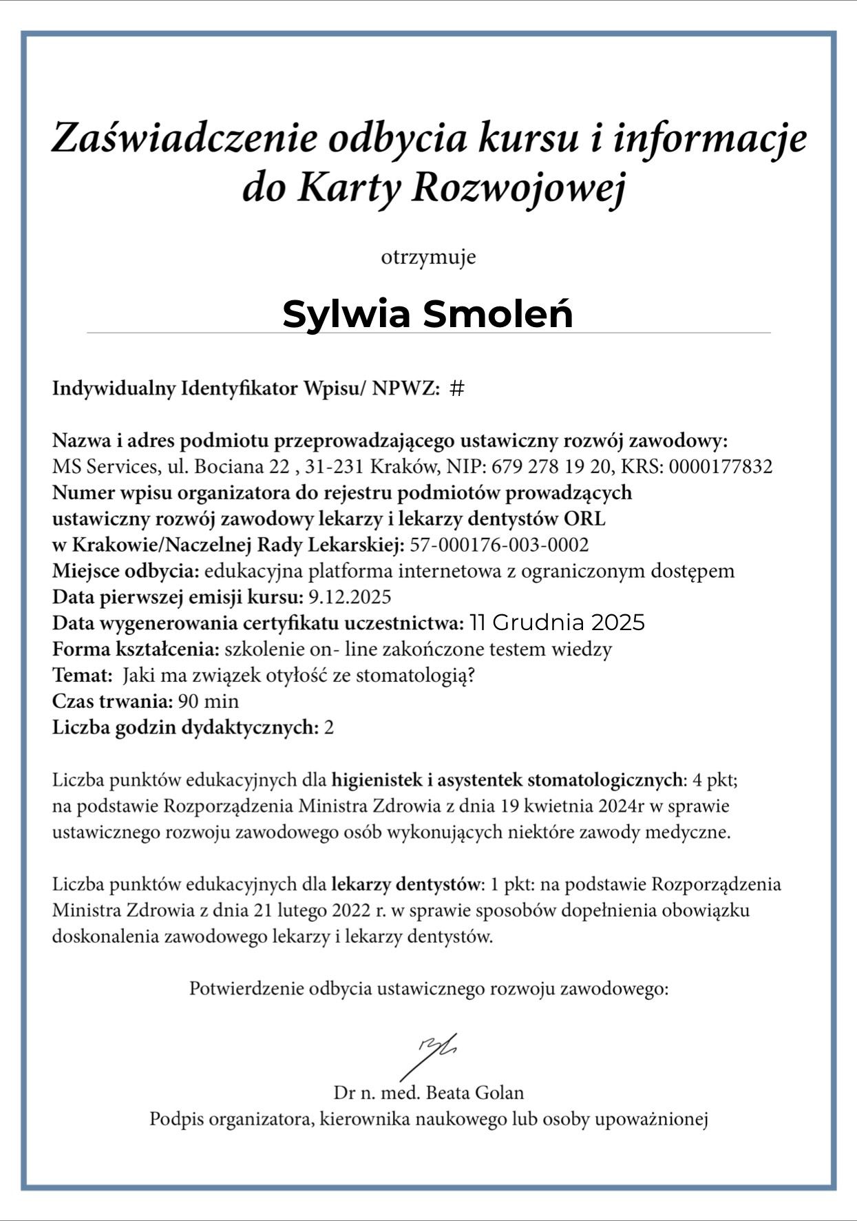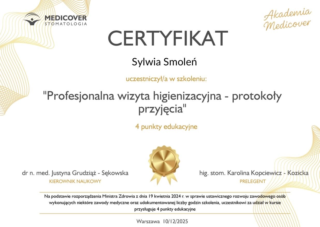 Jaki jest zakres porad oferowanych przez Sylwia Smoleń ?Sylwia Smoleń to higienistka/higienista stomatologiczny. Na podstawie swojego doświadczenia i wykształcenia Sylwia Smoleń oferuje usługi takie jak: higienizacja, pakiet higienizacyjny z instruktażem.