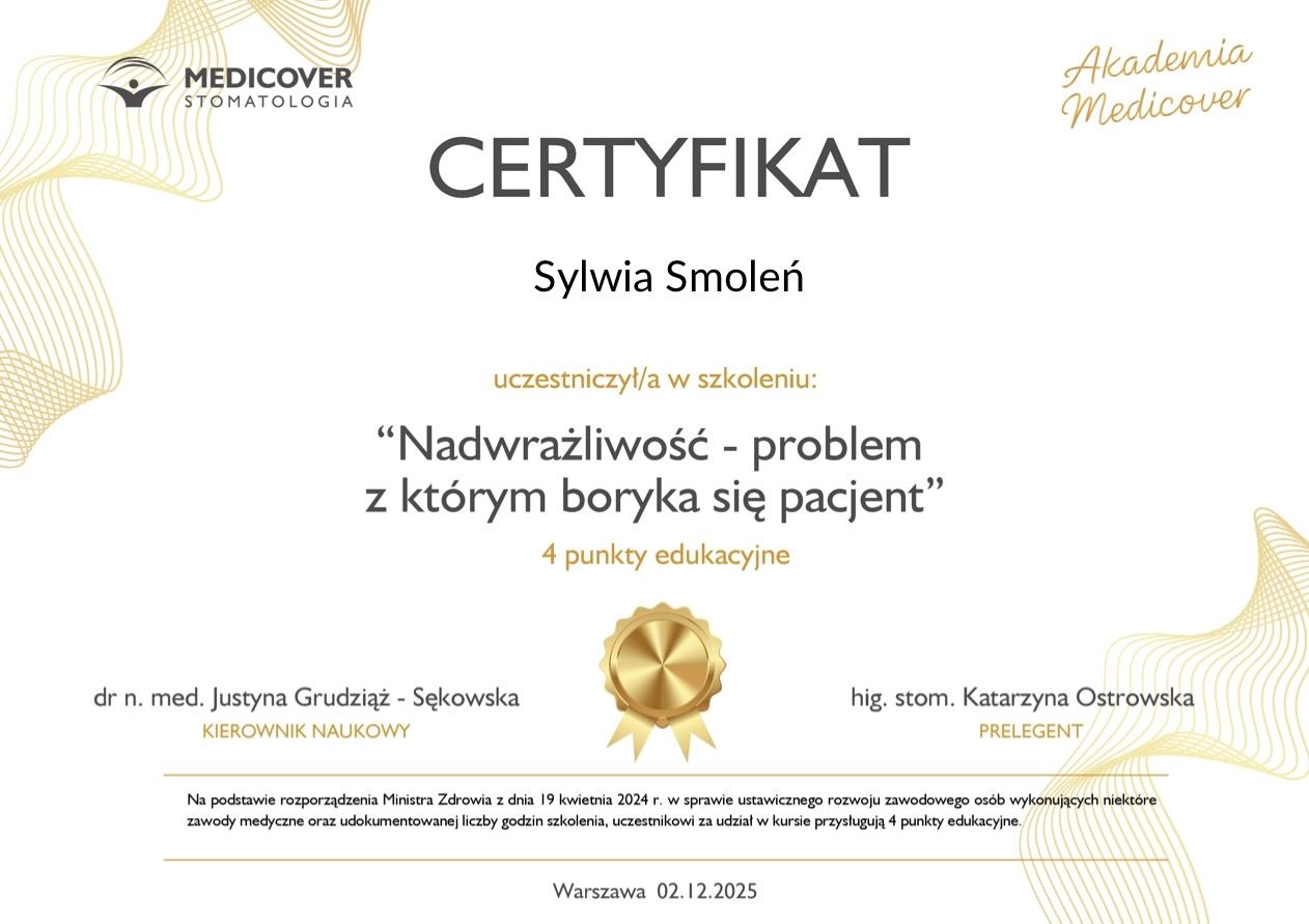 Pani Sylwia to absolutna perfekcjonistka w swoim fachu! Już od pierwszej wizyty czuć, że ma niesamowite podejście do pacjenta – wszystko tłumaczy, rozwiewa wątpliwości i sprawia, że stres znika w sekundę. Zabieg higienizacji? W jej wykonaniu to niemal relaks – delikatnie, dokładnie i z pełnym zaangażowaniem. Dzięki niej moje podejście do profilaktyki stomatologicznej zupełnie się zmieniło. Jeśli szukacie specjalistki z sercem do swojej pracy, to właśnie ją znaleźliście!