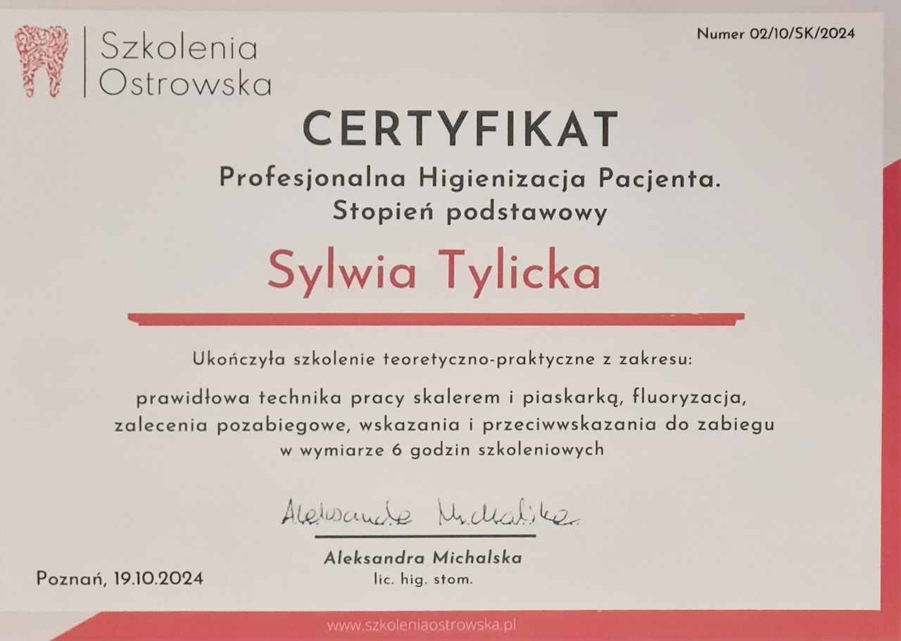 Wizyta u Pani Sylwii to sama przyjemność. Pani Sylwia posiada ogromną wiedzę, która chętnie się dzieli, udzieliła mi wiele wskazówek dotyczących szczotkowania zębów oraz nitkowania, dostosowanych do moich potrzeb. Cierpliwie odpowiedziała na wszystkie moje pytania. Sama wizyta odbyła się punktualnie, czyszczenie zębów wykonała perfekcyjnie, przy czym była bardzo delikatna. Pierwsze moje bezbolesne czyszczenie. Na pewno wrócę!