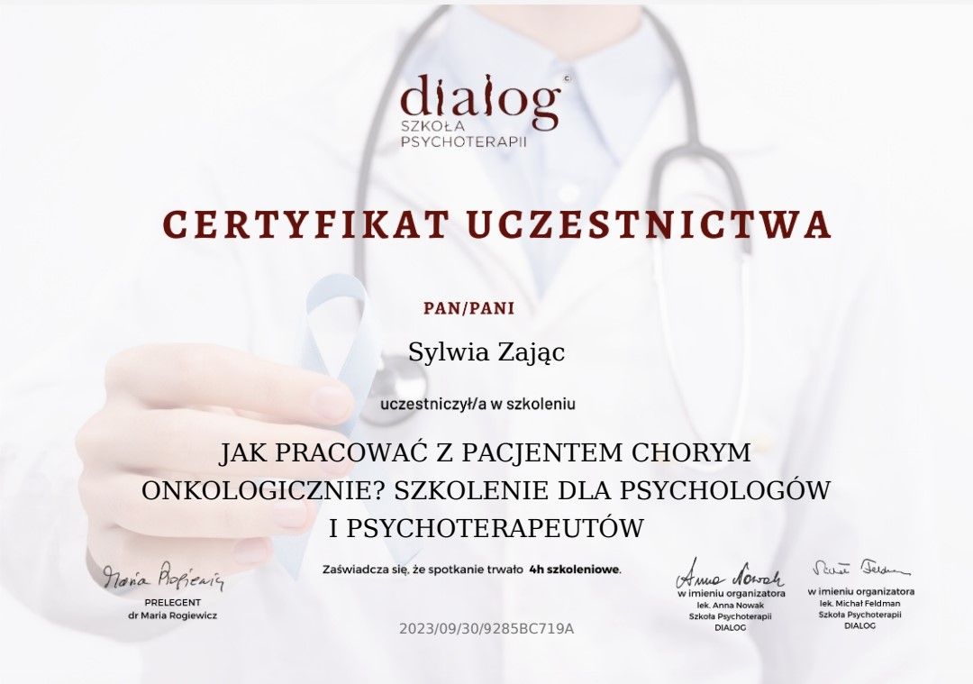 Jestem dyplomowany Psychologiem oraz Psychoterapeutką w nurcie poznawczo-behawioralnym CBT (w trakcie certyfikowanego szkolenia podyplomowego)