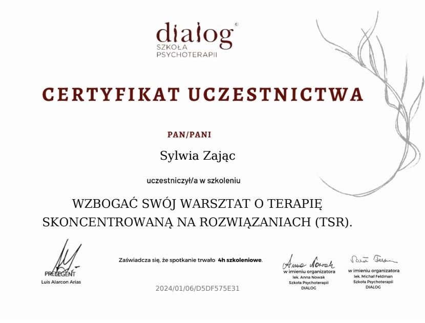 Jestem szczerze zadowolona ze wsparcia terapeutycznego u Pani Sylwii, która posiada umiejętność uważnego słuchania i zrozumienia. Pomogła mi zrozumieć mechanizmy zachowań, które są dla mnie ważne w zrozumieniu źródeł moich problemów.