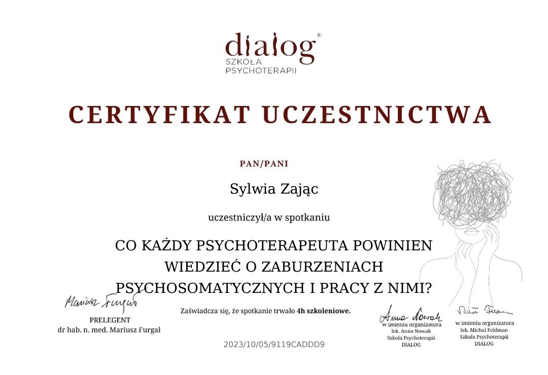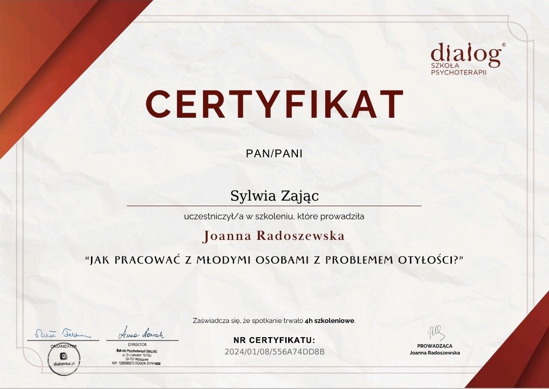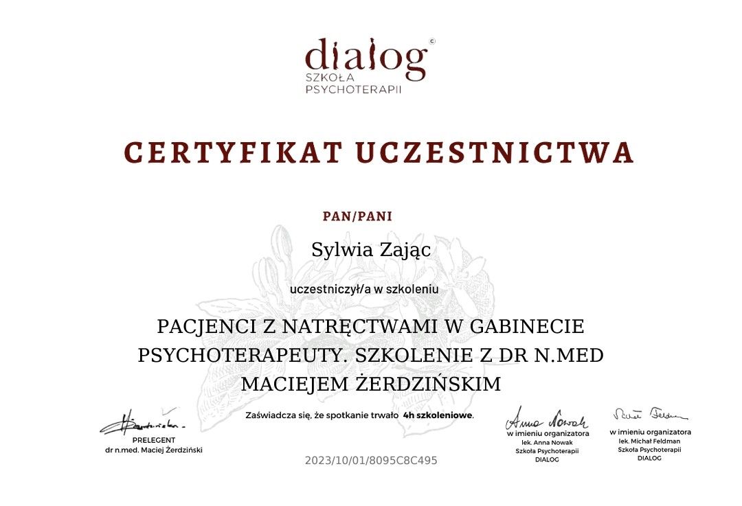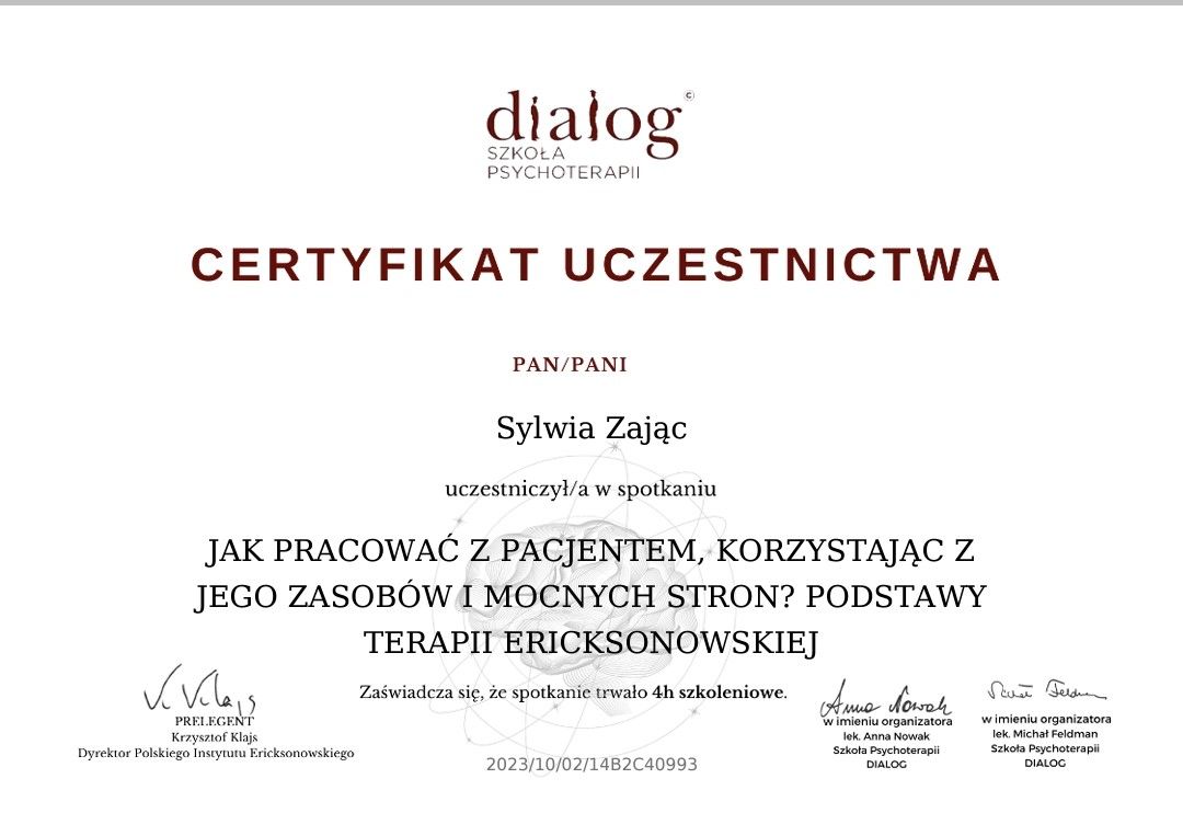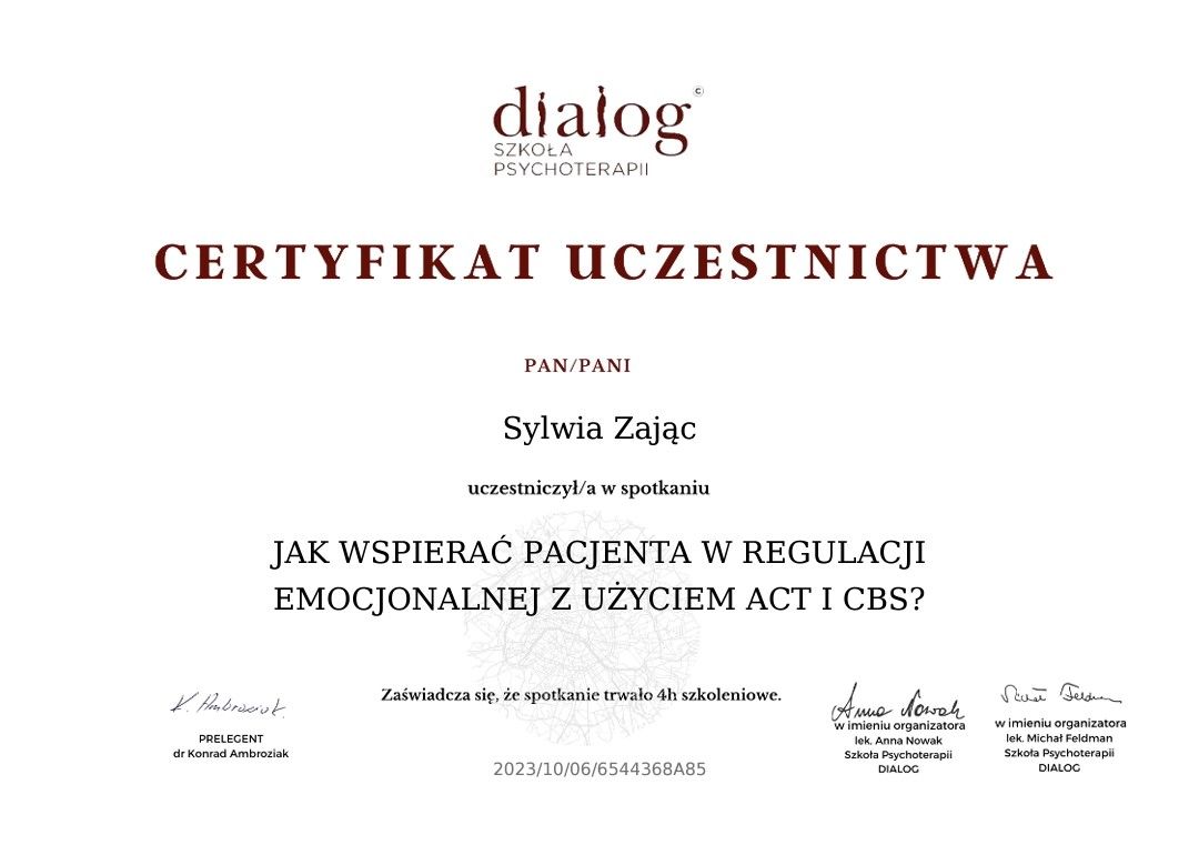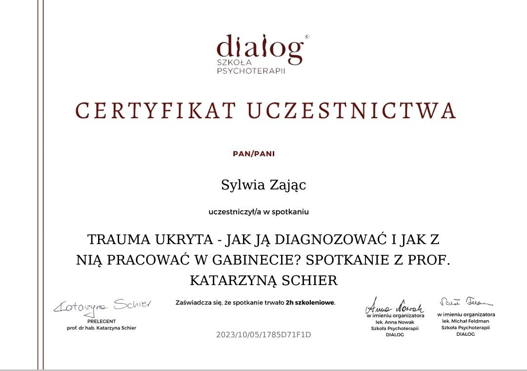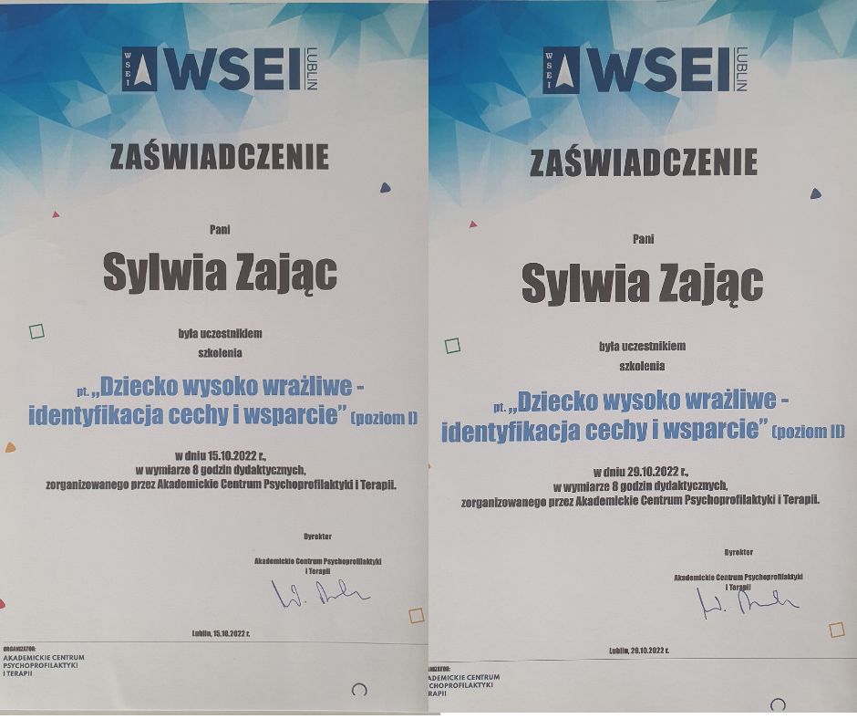 Ukończyłam wiele kursów i szkoleń z zakresu m.in. wysokiej wrażliwości, traumy, zaburzeń lękowych, depresyjnych, kompulsyjno-obsesyjnych, zaburzeń osobowości, trudności w związku i relacjach, stresu itp.