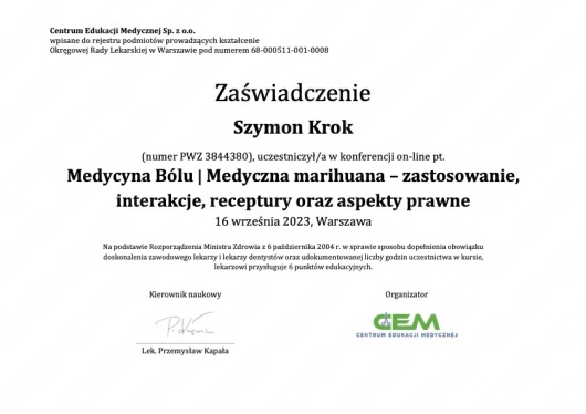 Posiadam doświadczenie w ambulatoryjnym leczeniu bólu, w tym terapii z zastosowaniem preparatów konopnych. W pracy z pacjentem kładę nacisk na rzetelną diagnostykę, indywidualne podejście oraz dobór optymalnej metody leczenia, z uwzględnieniem bezpieczeństwa i komfortu pacjenta.