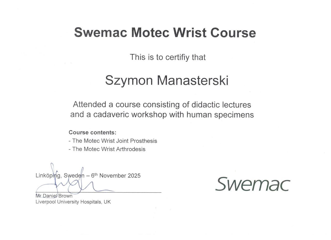 Swoją wiedzę poszerzałem uczestnicząc w licznych kursach i szkoleniach w ośrodkach o najwyższych stopniach referencyjności na terenie całego kraju. Byłem uczestnikiem licznych konferencji z zakresu chirurgii ręki oraz mikrochirurgii (FESHH, BSSH, EFSM). Umiejętności praktyczne miałem okazje szlifować na licznych kursach cadaverowych w Polsce i Austrii (Graz).