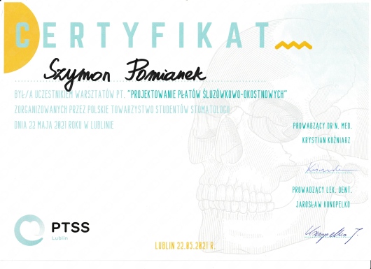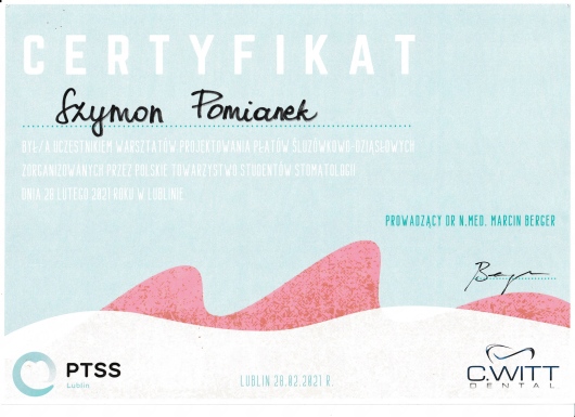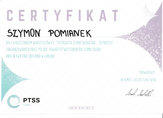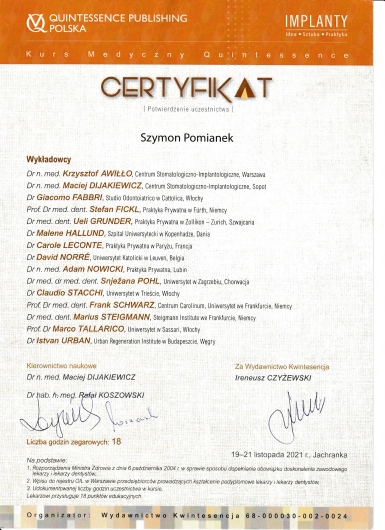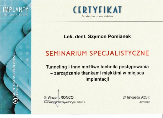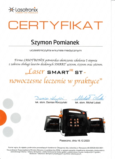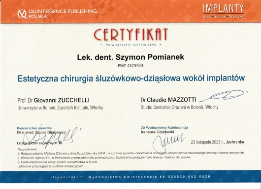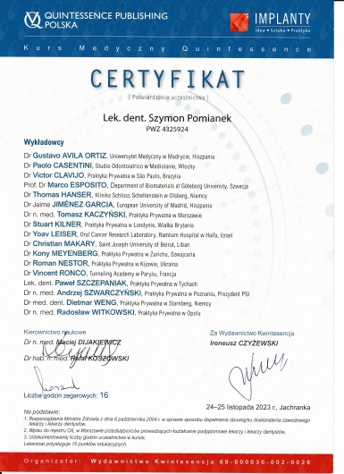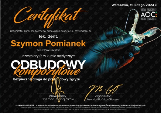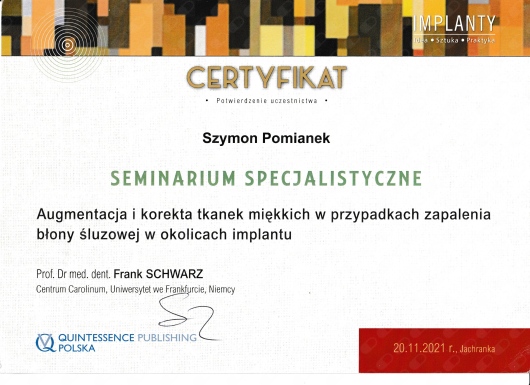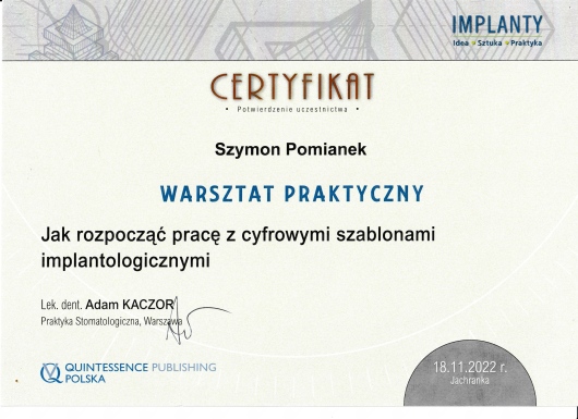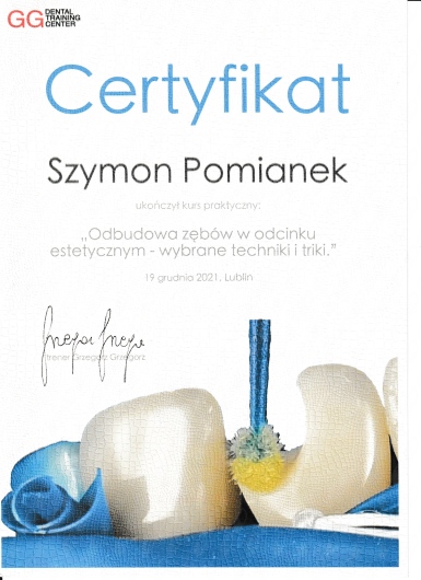 Jaki jest zakres porad oferowanych przez Szymon Pomianek?Szymon Pomianek to stomatolog. Na podstawie swojego doświadczenia i wykształcenia Szymon Pomianek oferuje usługi takie jak: Konsultacja stomatologiczna, konsultacja implantologiczna, leczenie zachowawcze, Higienizacja pod mikroskopem, laserowe wybielanie zębów, wkład koronowo - korzeniowy, szyna relaksacyjna, korona cyrkonowa, implanty, wkład z włókna szklanego.