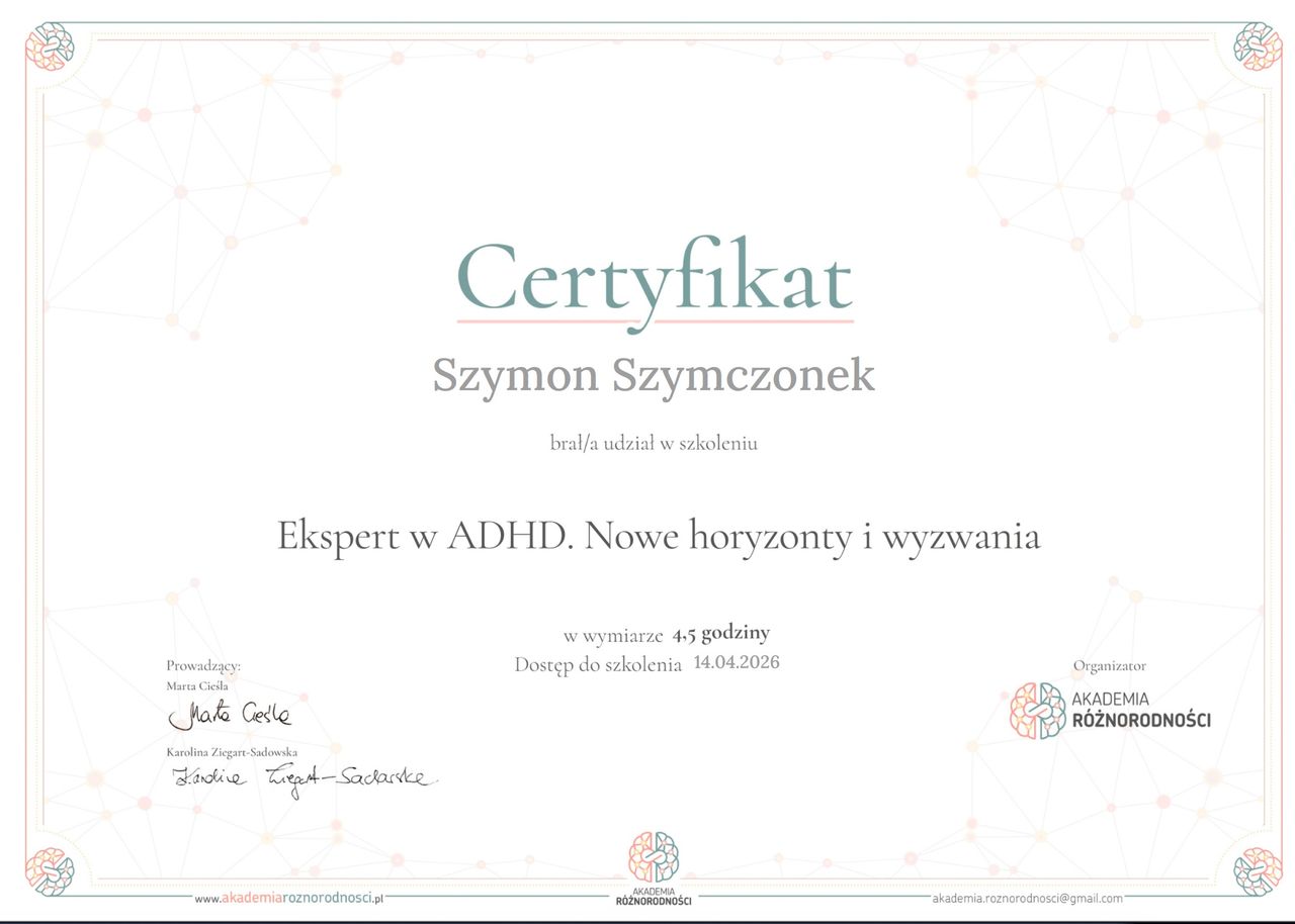 Robiłem z Panem Szymonem diagnozę ADHD. Zdecydowanie polecam, świetna atmosfera i zaangażowanie.