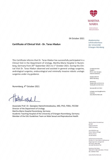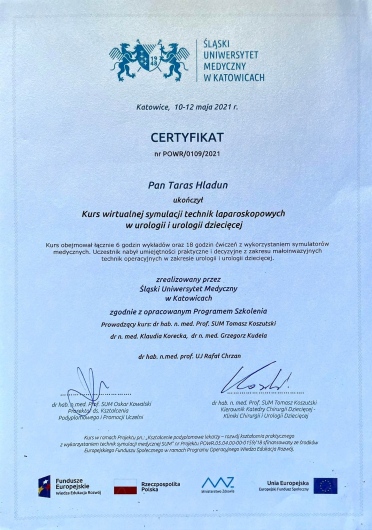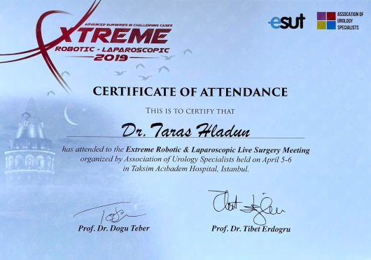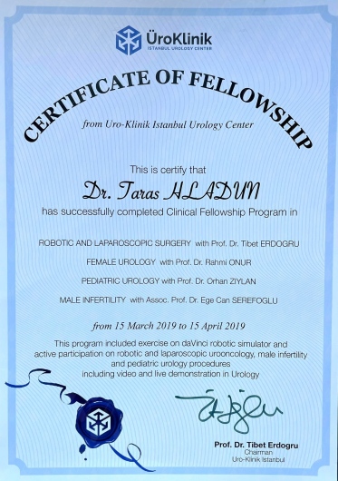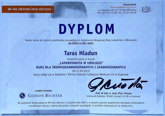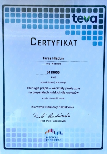 I graduated from the Faculty of Medicine of the Lviv National Medical University named by Daniel Halytskyi. In the years 2013-2016 I completed a training in general surgery at the Oncology Center in Lviv. In 2018, I started my urological specialization at the Urology Department with the Urological Oncology sub-unit in Nowa Sól. In 2019 I completed a fellowship in robotized urology, endourology and andrology at the prestigious clinic in Istanbul. 2021 - I completed an internship in reconstructive urology and surgical andrology at the reference andrology center in Nuremberg. In 2021 I took part in Young Urologist Leadership course organized by EAU. Since 2022 I am training to perform the laser prostate operation surgery HOLEP in Berlin. In 2024 - passed the EBU examination and finalised my urologic specialization. I regularly improve my surgical skills on numerous training courses. I’ve attended laparoscopic urology courses at the Urology Clinics in Krakow and Katowice, penile surgery and aesthetic urology courses in Warsaw. Every year I participate in scientific congresses and write scientific articles for Polish and international journals.