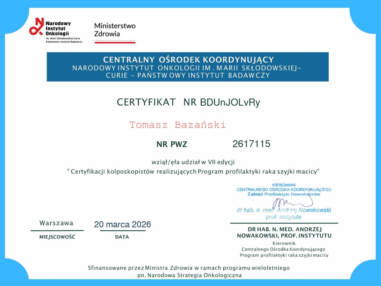 1. Certyfikat Polskiego Towarzystwa Ginekologów i Położników w zakresie Kolposkopii