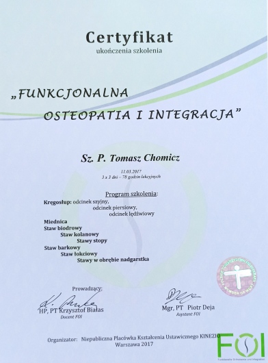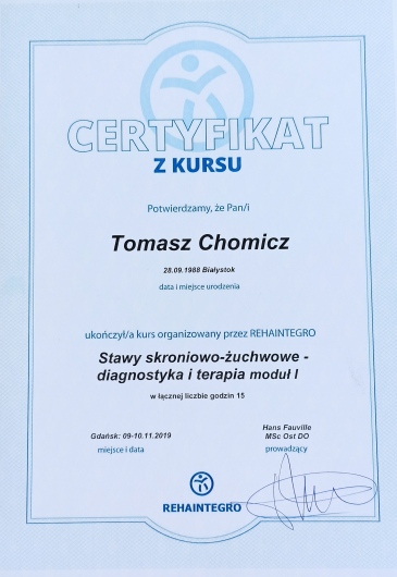 Pan Tomasz Chomicz przeprowadził rzetelny i dokładny wywiad starając się dotrzeć do źródła mojego problemu. Przedstawił plan leczenia i zalecenia do wykonywania w domu. Bardzo polecam.