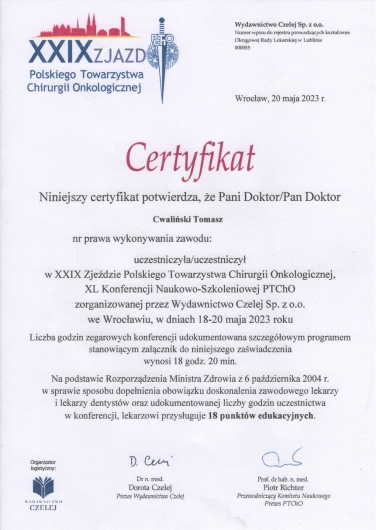 Jaki jest zakres porad oferowanych przez Tomasz Cwaliński?Tomasz Cwaliński to chirurg, chirurg onkologiczny. Na podstawie swojego doświadczenia i wykształcenia Tomasz Cwaliński oferuje usługi takie jak: Konsultacja chirurgiczna, kwalifikacja do operacji, badania diagnostyczne, badania profilaktyczne, chirurgiczne wycięcie znamienia z badaniem histopatologicznym, Wycięcie znamion barwnikowych, włókniaków, brodawek, zmian skórnych, Wycięcie znamiona, kaszaka, tłuszczaka w znieczuleniu (zmiana pojedyncza), Usunięcie szwów, konsultacja onkologiczna przedoperacyjna, kwalifikacja do leczenia onkologicznego.