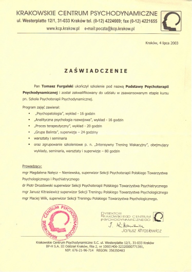 Profesjonalny, zaangażowany, tłumaczący wszystko krok po kroku oraz rozwijający wątki w sposób zrozumiały i jasny. Widać, że mgr T. Furgalski ma ogromną wiedzę oraz skutecznie z niej korzysta, a jednocześnie umiejętności miękkie sprawiają, że każda wizyta jest bardzo miłym i wyczekiwanym momentem dającym realne efekty w życiu codziennym. Serdecznie polecam i jestem pełna podziwu wobec kompetencji i braku tracenia przygotowania na każdą wizytę.