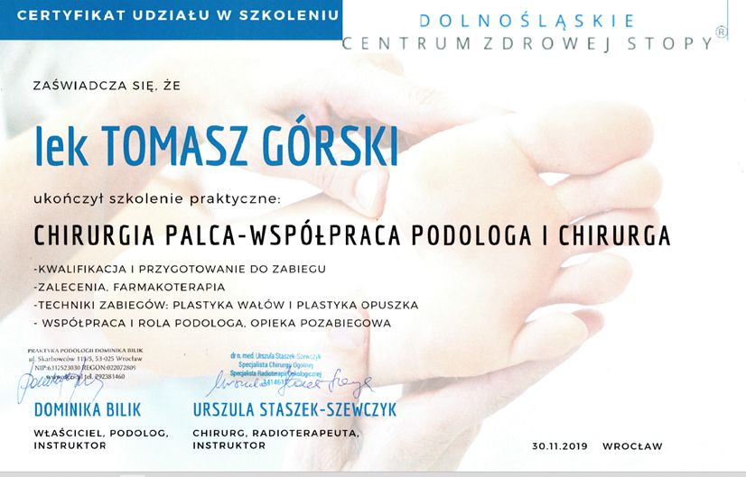 Jaki jest zakres porad oferowanych przez Tomasz Górski?Tomasz Górski to ortopeda. Na podstawie swojego doświadczenia i wykształcenia Tomasz Górski oferuje usługi takie jak: plastyka wałów okołopaznokciowych, leczenie wrastającego paznokcia metodą fenolizacji macierzy, usunięcie fibromy, usunięcie egzostozy podpaznokciowej, kwalifikacja do zabiegu.