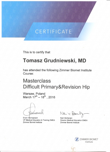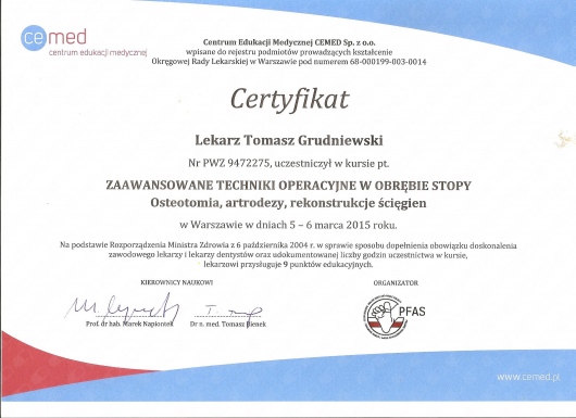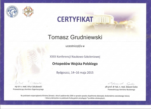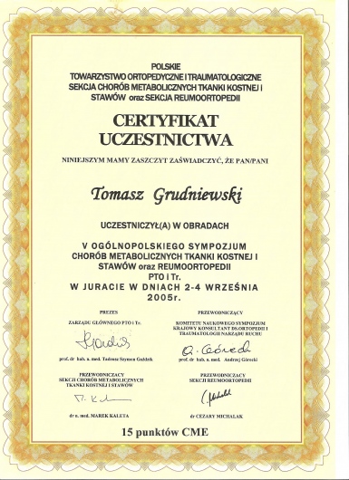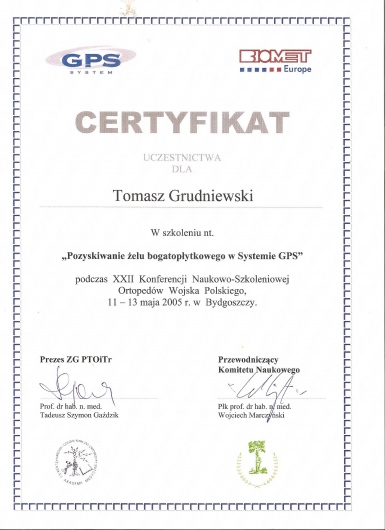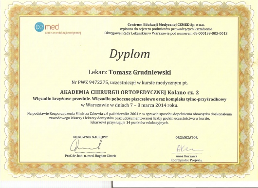 Doktor nauk medycznych, autor publikacji naukowych w literaturze medycznej, członek Polskiego Towarzystwa Ortopedii i Traumatologii Narządu Ruchu (PTOiTr).