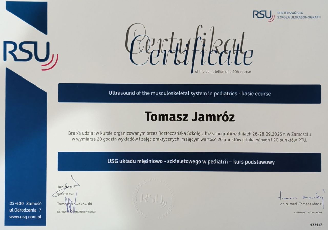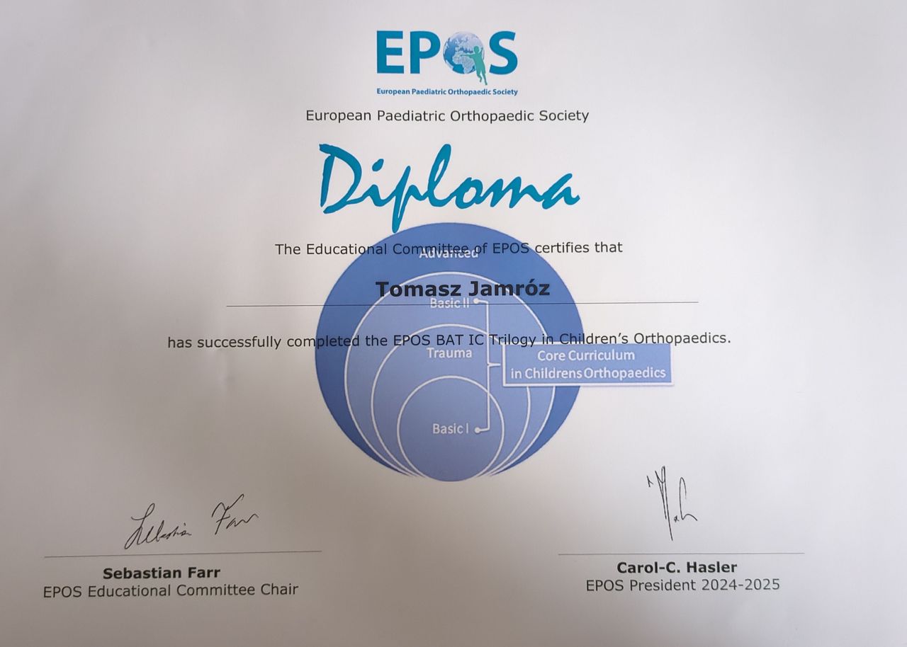 Stale podnoszę swoje kwalifikacje, aby oferować pacjentom opiekę zgodną z najnowszymi standardami medycznymi. Ukończyłem między innymi kompleksowy cykl szkoleń EPOS BAT IC Trilogy, organizowany przez Europejskie Towarzystwo Ortopedii Dziecięcej.