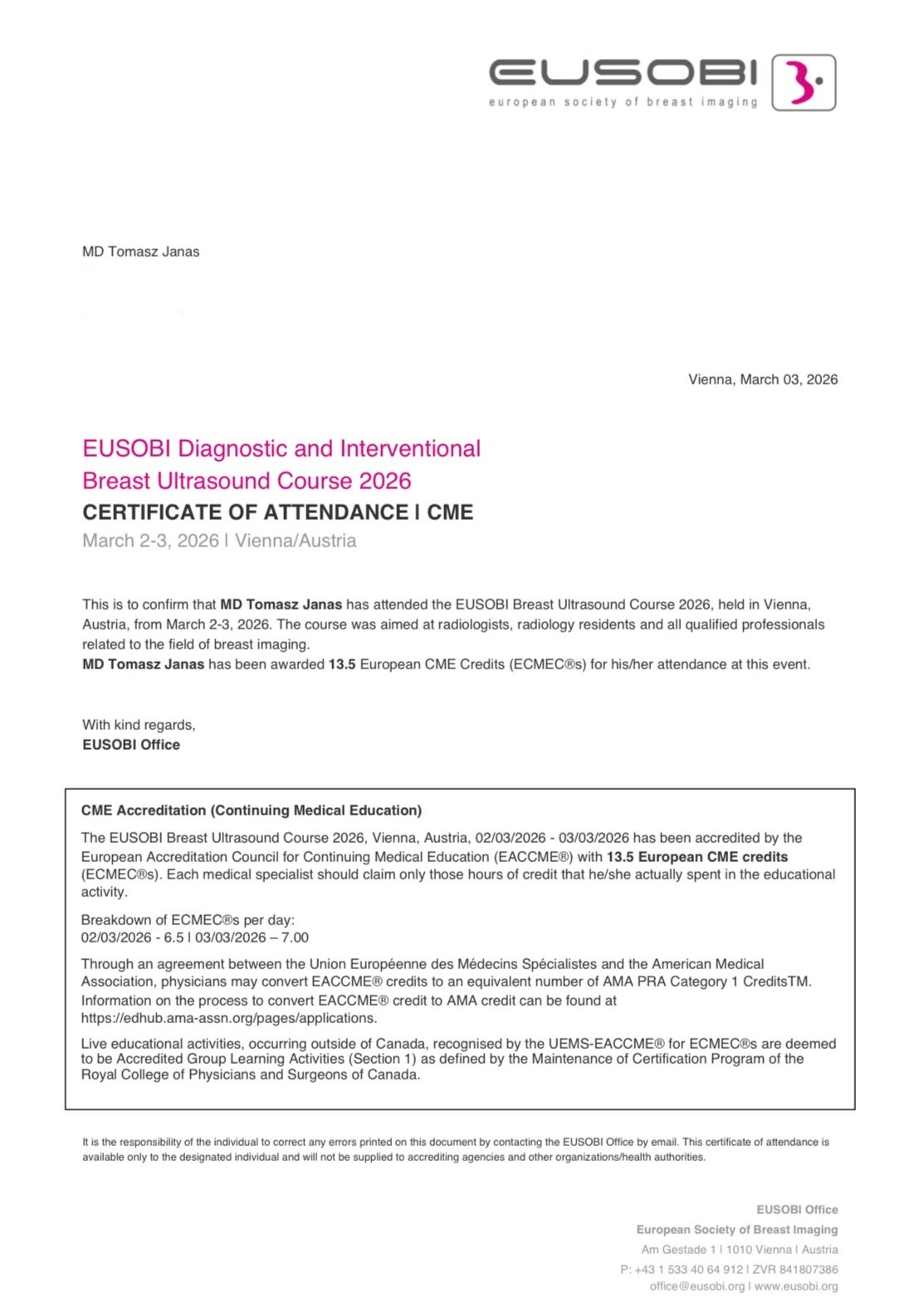 Obecnie pracuję jako lekarz w trakcie specjalizacji z Radiologii i Diagnostyki Obrazowej w Zakładzie Radiologii Ogólnej, Radiologii Zabiegowej i Neuroradiologii w Uniwersyteckim Szpitalu Klinicznym im. Jana Mikulicza-Radeckiego we Wrocławiu.