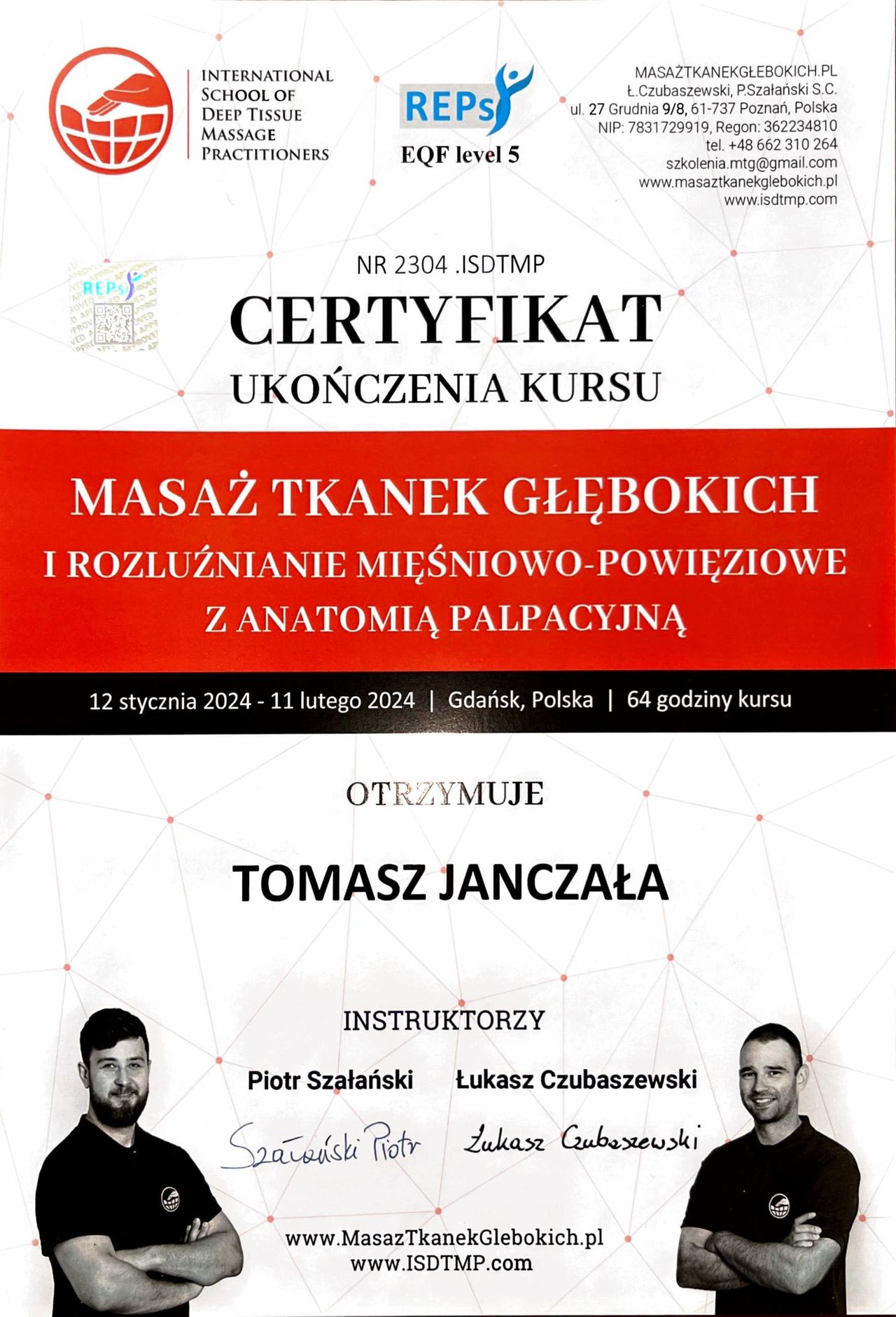 Jaki jest zakres porad oferowanych przez Tomasz Janczała?Tomasz Janczała to fizjoterapeuta. Na podstawie swojego doświadczenia i wykształcenia Tomasz Janczała oferuje usługi takie jak: ćwiczenia korekcyjne, Diagnostyka + Terapia Manualna, fizjoterapia, Fizjoterapia (pierwsza wizyta), igłoterapia, INDIBA oraz INDIBA + terapia manualna, INDIBA terapia, konsultacja fizjoterapeutyczna, terapia stawów skroniowo-żuchwowych, masaż głęboki.