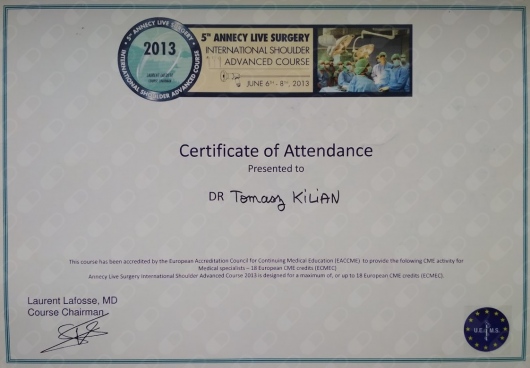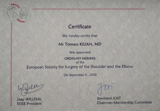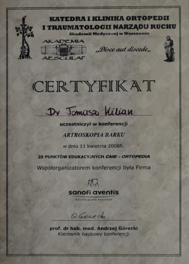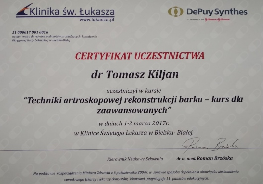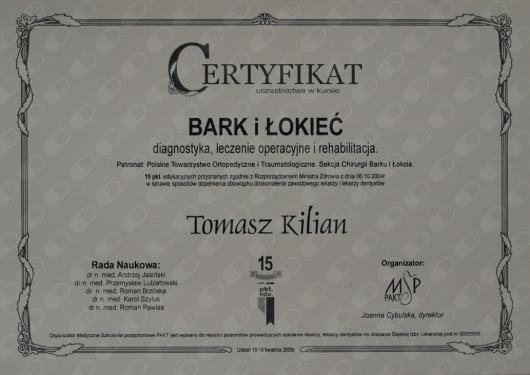 Od początku pracy na ortopedii doktor Kilian interesuje się nowoczesnym, zwłaszcza małoinwazyjnym podejściem do problemów klinicznych. Dość wcześnie, bo już w drugim roku pracy zaczął interesować się chorobami barku i ich leczeniem. Artroskopię barku wykonuje od 2009 r. i jest jej organizatorem w toruńskim szpitalu, a także innowatorem kilku zabiegów.