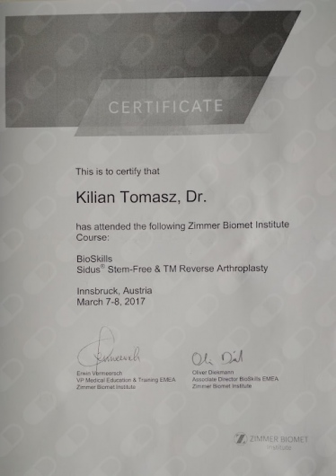 Swoje umiejętności podnosi na kursach (w dużej mierze zagranicznych) oraz podczas pobytów na salach operacyjnych bardziej znanych chirurgów. Ambulatoryjnie doktor Kilian zajmuje się konsultacjami z zakresu ortopedii dorosłych – diagnostyką chorób, leczeniem farmakologicznym, iniekcjami miejscowymi oraz instruktażem rehabilitacyjnym.