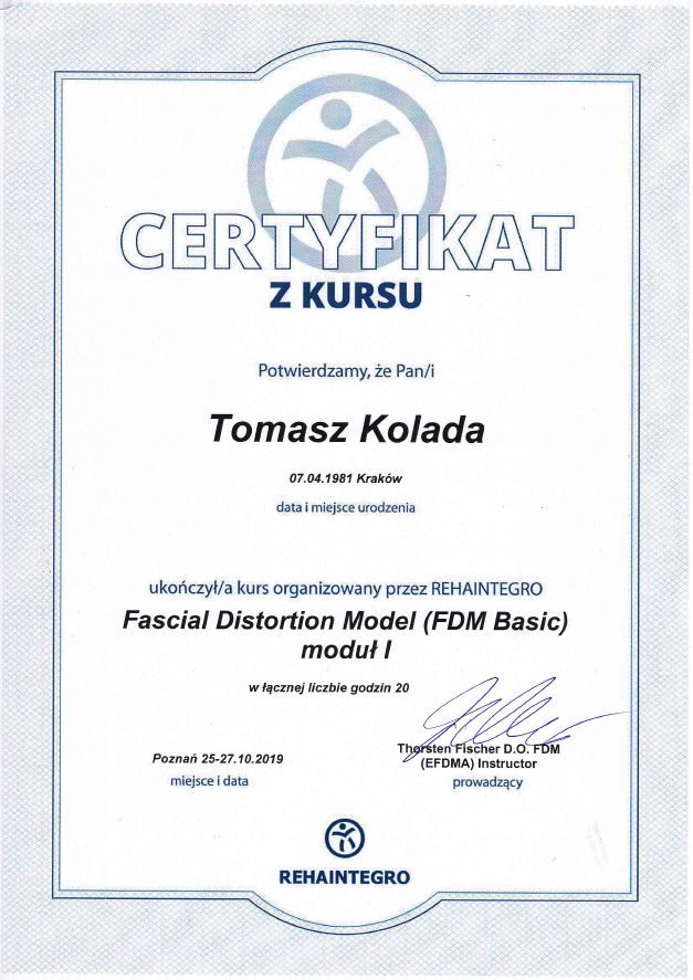 Jaki jest zakres porad oferowanych przez Tomasz Kolada?Tomasz Kolada to fizjoterapeuta. Na podstawie swojego doświadczenia i wykształcenia Tomasz Kolada oferuje usługi takie jak: rehabilitacja kręgosłupa, terapia mięśniowo-powięziowa, konsultacja fizjoterapeutyczna, masaż, Terapia tkanek miękkich.