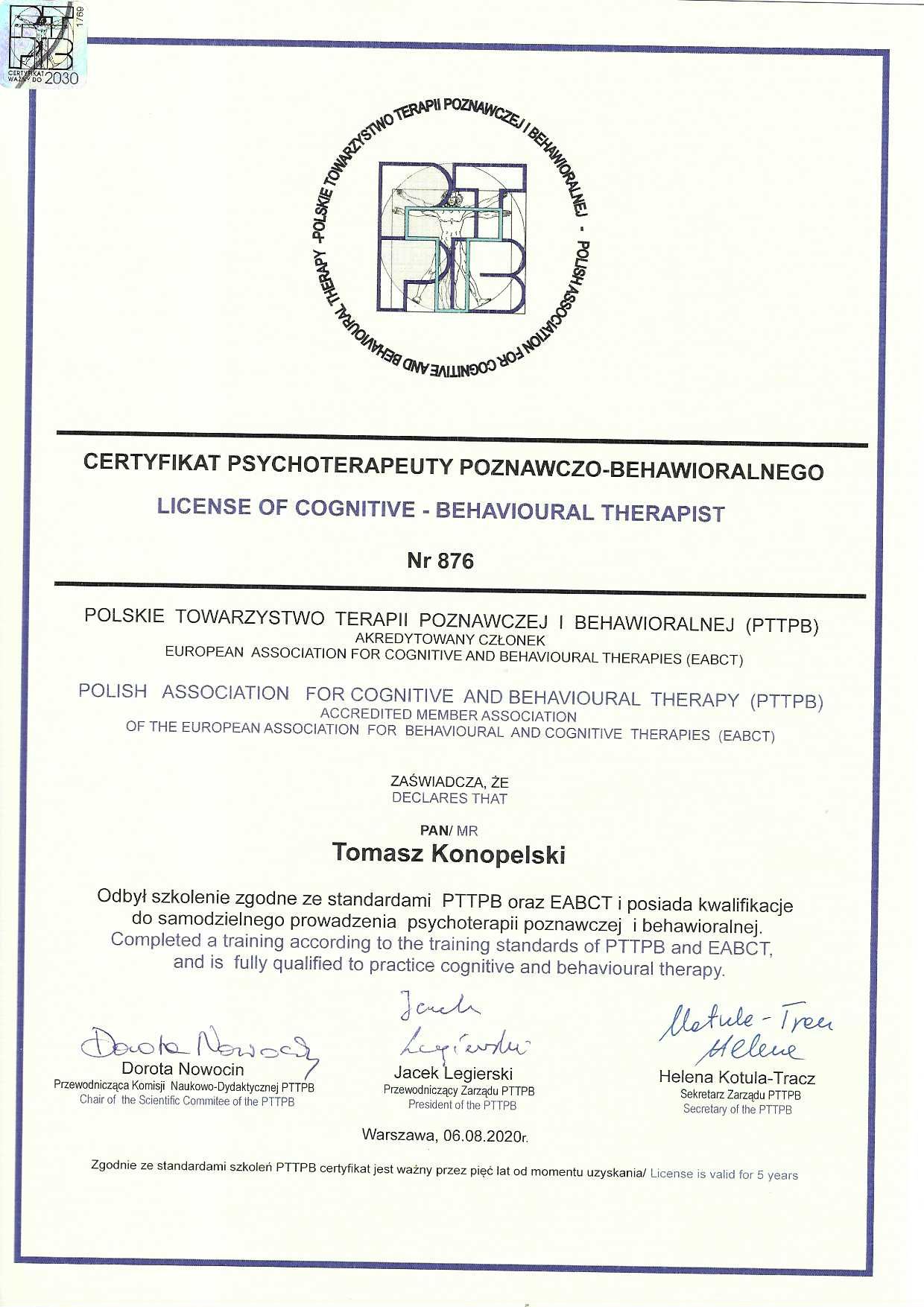 Psycholog i certyfikowany psychoterapeuta poznawczo- behawioralny Polskiego Towarzystwa Terapii Poznawczej i Behawioralnej (nr 876), absolwent Szkoły Psychoterapii Poznawczo- Behawioralnej Uniwersytetu SWPS pod kierownictwem dr Agnieszki Popiel i dr Ewy Pragłowskiej, a także studiów podyplomowych z zakresu psychosomatyki i somatopsychologii na Uniwersytecie SWPS w Poznaniu. Członek Polskiego Towarzystwa Terapii Poznawczej i Behawioralnej (PTTPB). Współpracuje z Uniwersytetem SWPS w Poznaniu. Prowadzi konsultacje psychologiczne i psychoterapię indywidualną. Pracuje w podejściu poznawczo- behawioralnym. Swoją ofertę kieruje do osób dorosłych cierpiących na zaburzenia depresyjne, zaburzenia lękowe (w tym: fobię społeczną, zespół lęku napadowego, lęk o zdrowie, fobie specyficzne, zespół lęku uogólnionego), zaburzenia obsesyjno-kompulsyjne, zespół stresu pourazowego, zaburzenia adaptacyjne i zaburzenia osobowości. Każda Sesja trwa 45/50 minut. Doświadczenie zawodowe zdobywał w: Wojewódzkim Szpitalu dla Nerwowo i Psychicznie Chorych "Dziekanka" im. Aleksandra Piotrowskiego w Gnieźnie Wielkopolskim Centrum Pulmonologii i Torakochirurgii, Szpital w Chodzieży na Oddziale Opieki Paliatywnej, Oddziałach Chorób Płuc i Oddziałach Rehabilitacyjnych. Szpitalu Miejskim im. Franciszka Raszei w Poznaniu na Oddziale Toksykologicznym, Oddziale Chirurgii Ogólnej, Oddziale Otolaryngologicznym, Oddziale Ginekologiczno- Położniczym z Patologią Ciąży Poznańskim Ośrodku Zdrowia Psychicznego w Poznaniu na Oddziale Dziennym Psychiatrycznym, Rehabilitacyjnym. Wojewódzkim Szpitalu Neuropsychiatrycznym w Kościanie. Poradni Psychologiczno-Pedagogicznej dla Dzieci i Młodzieży w Poznaniu. Szpitalu Klinicznym im. Heliodora Święcickiego UM w Poznaniu na Oddziale Klinicznym Dermatologii. Ośrodku Rehabilitacyjno- Wypoczynkowym Wielspin. Swoją wiedzę poszerza stale szkoląc się w kraju i za granicą. Pracę poddaje regularnej superwizji, przestrzega zasad kodeksu etycznego zawodu psychologa i psychoterapeuty Poznawczo- Behawioralnego.