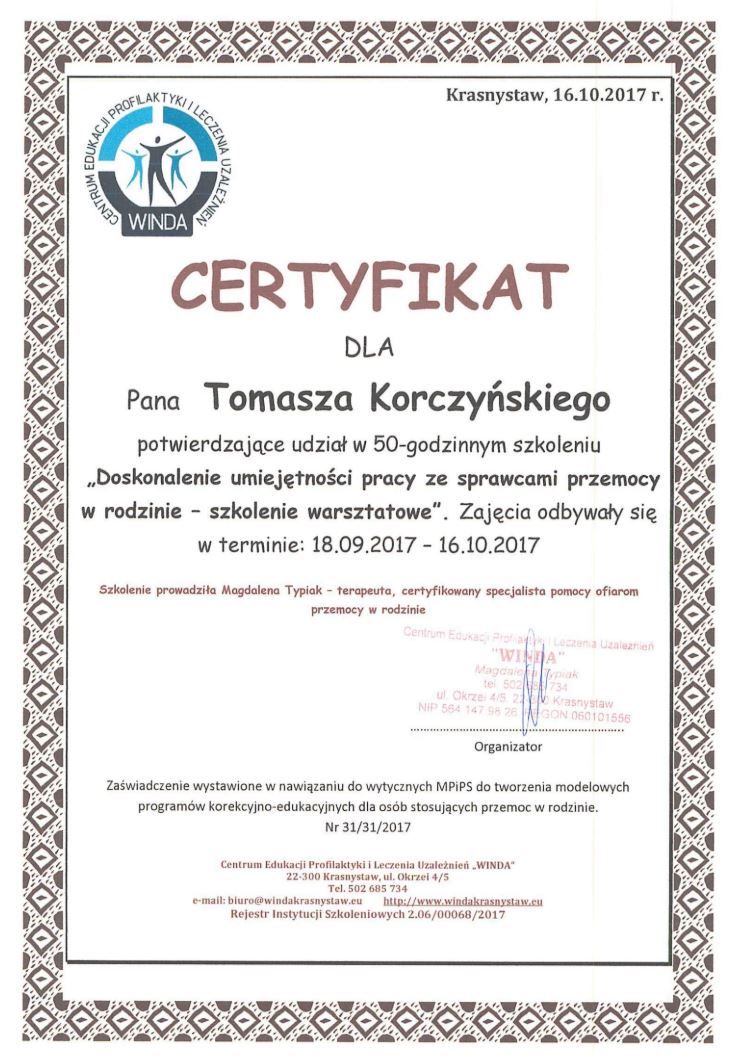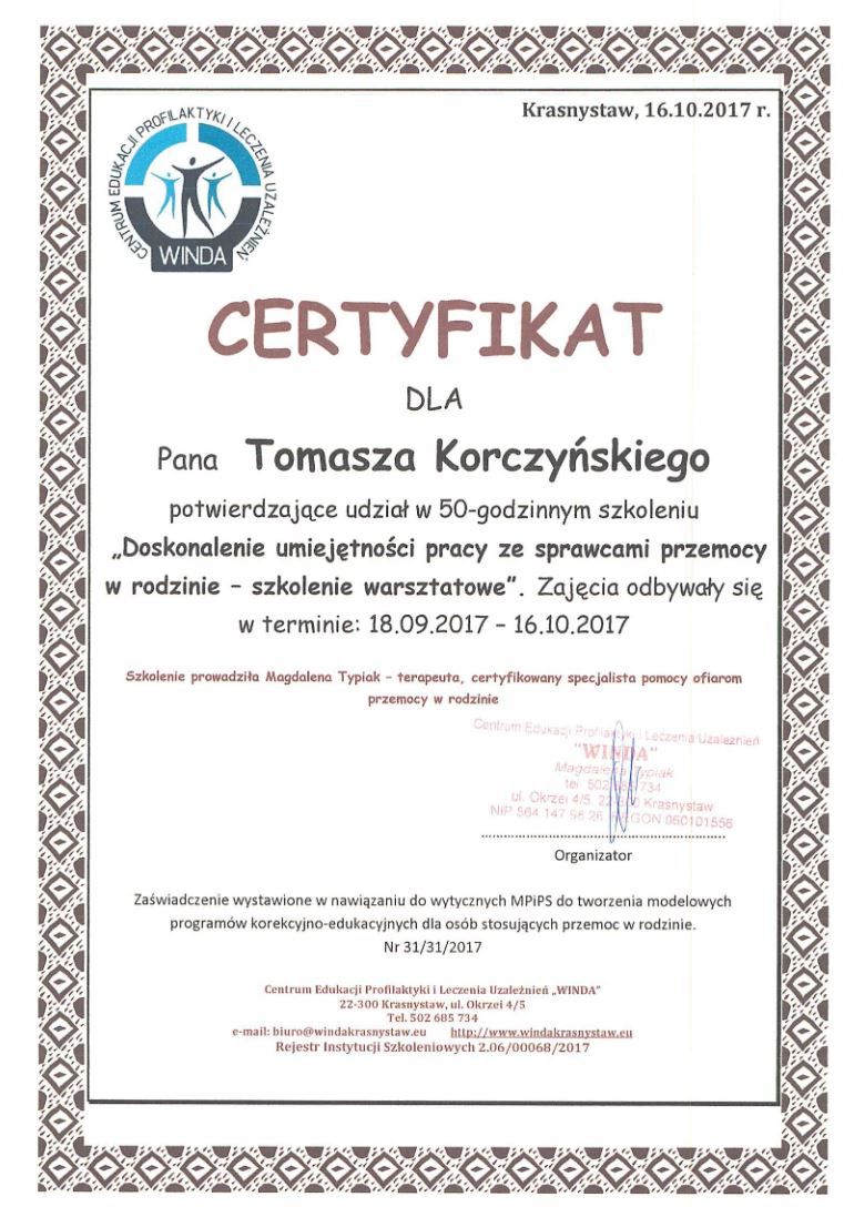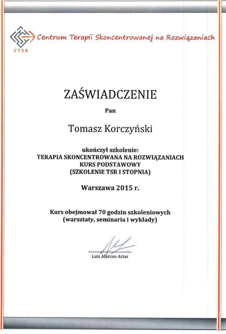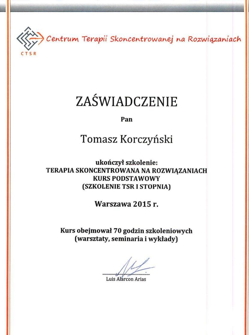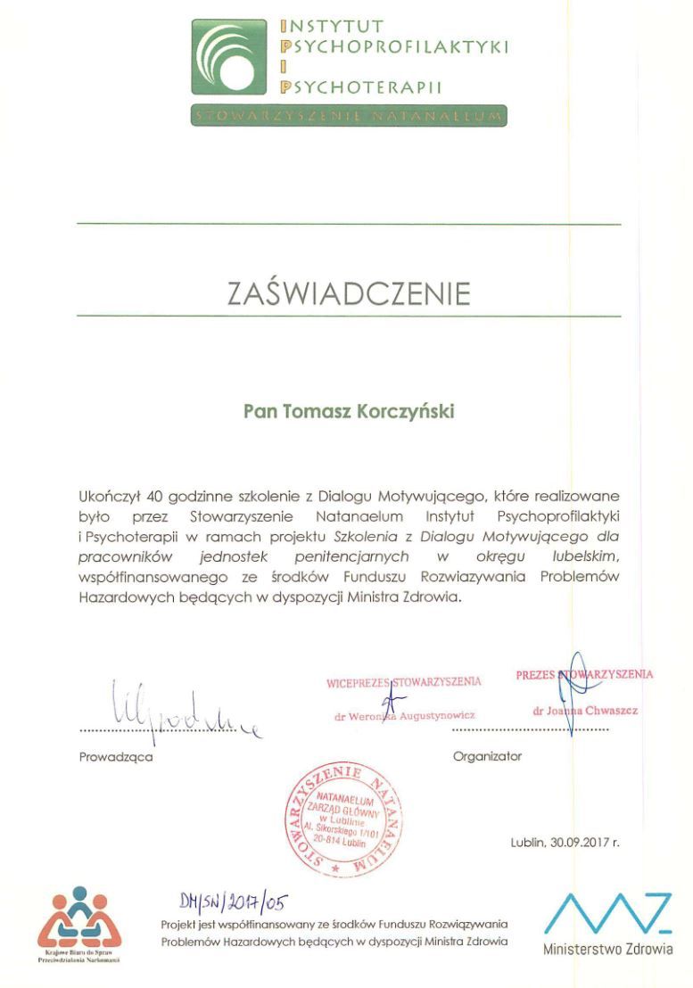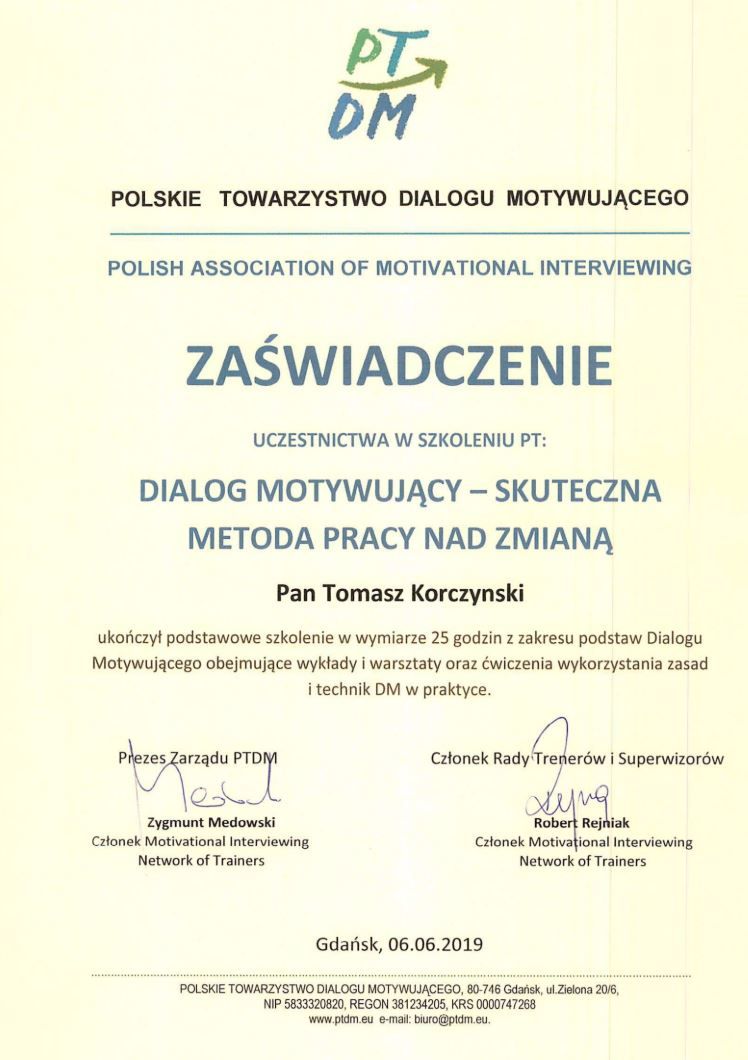 Jestem absolwent kursów w zakresie Dialogu Motywującego oraz Terapii Skoncentrowanej