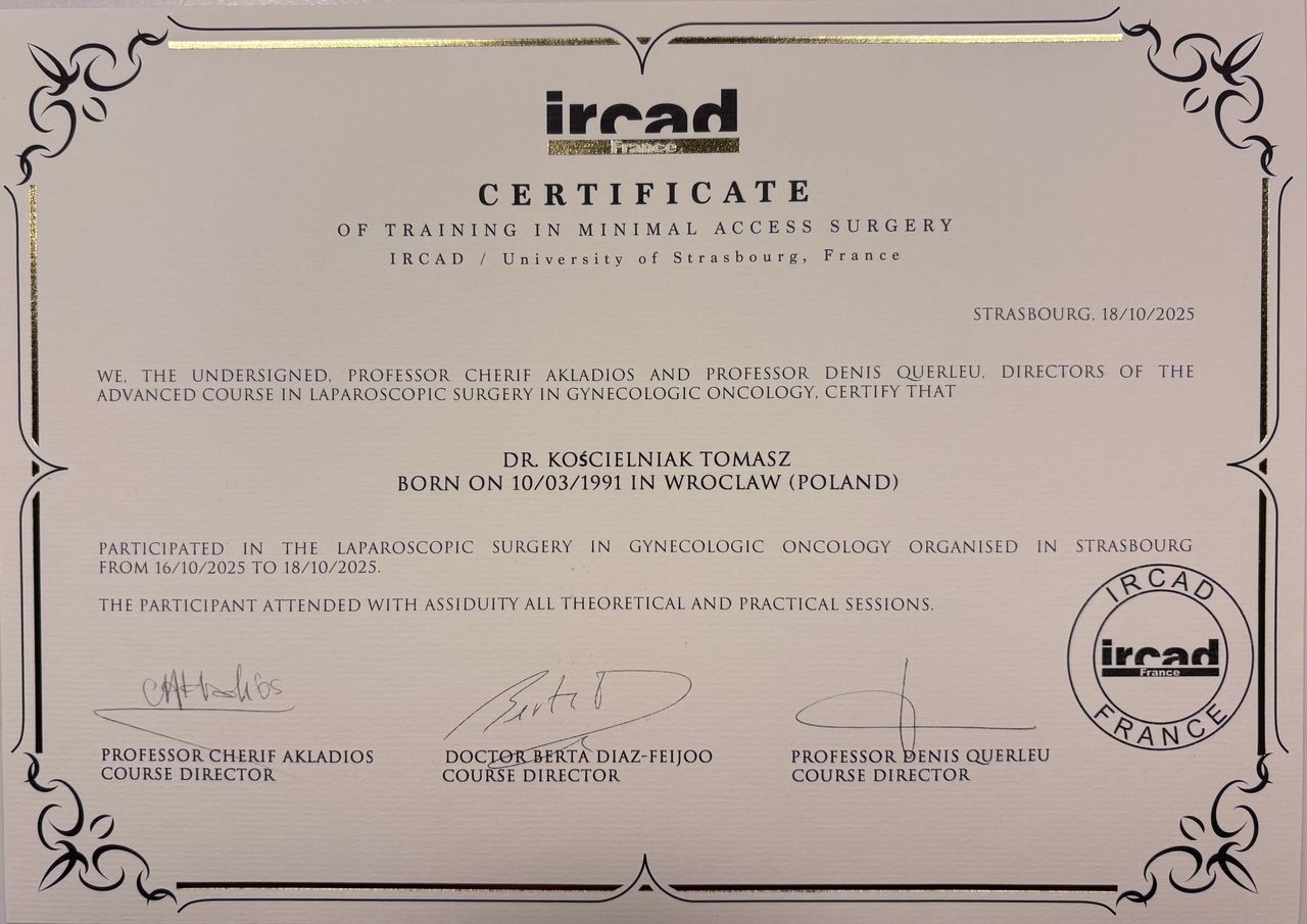 64 opinieJestem absolwentem Uniwersytetu Medycznego im. Piastów Śląskich we Wrocławiu. Pracuje na Klinicznym Oddziale Ginekologii Onkologicznej i Prokreacyjnej w 4 Wojskowym Szpitalu Klinicznym we Wrocławiu oraz dyżuruję na Oddziale Ginekologii i Położnictwa w szpitalu "Latawiec" w Świdnicy. Jestem członkiem Polskiego Towarzystwa Ginekologicznego, Miedzynarodowego Towarzystwa Ultrasonografii w Położnictwie i Ginekologii (ISUOG) oraz Europejskiego Towarzystwa Ginekologii Onkologicznej (ESGO). W pracy zawodowej interesuję się szczególnie leczeniem operacyjnym schorzeń narządu rodnego(histeroskopia, laparoskopia) oraz diagnostyką prenatalną. Posiadam m. in. certyfikat The Fetal Medicine Foundation na wykonywanie badań prenatalnych, certyfikat wykonywania badań prenatalnych sekcji ultrasonografii Polskiego Towarzystwa Ginekologów i Położników oraz certyfikat Polskiego Towarzystwa Kolposkopii i Patofizjologii Szyjki Macicy.