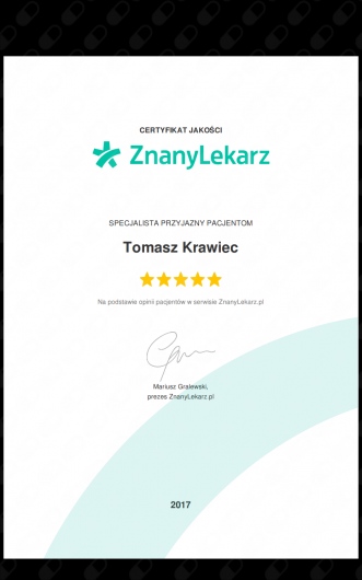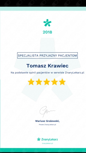 Jak Tomasz Krawiec umawia wizyty?Tomasz Krawiec używa kalendarza ZnanyLekarz, dlatego na stronie widzisz aktualne terminy. Wystarczy, że wybierzesz datę i godzinę, które odpowiadają Ci najbardziej. Umawianie wizyty jest darmowe, a tuż przed terminem wyślemy Ci przypomnienie.