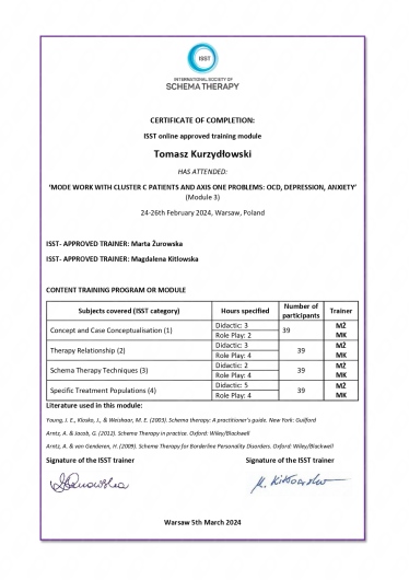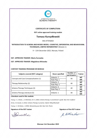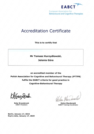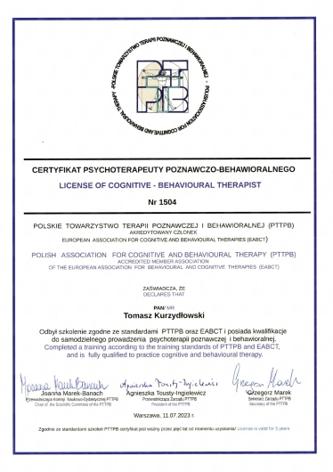 Jestem psychologiem oraz certyfikowanym psychoterapeutą poznawczo-behawioralnym (certyfikat nr 1504). Pracuję w prywatnym gabinecie z osobami dorosłymi oraz z parami. Prowadzę psychoterapię osób dorosłych w nurtach: Terapia Poznawczo-Behawioralna (CBT), Terapia Akceptacji i Zaangażowania (ACT), Terapia Schematu (ST) oraz Terapię dla Par Skoncentrowaną na Emocjach (EFT wg Sue Johnson).