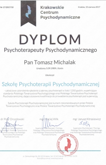 Ukończyłem dyplomem Szkołę Psychoterapii Psychodynamicznej w Krakowskim Centrum Psychodynamicznym.
