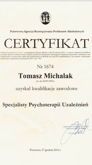 Uzyskałem Certyfikat Specjalisty Psychoterapii Uzależnień - PARPA (nr 1674).