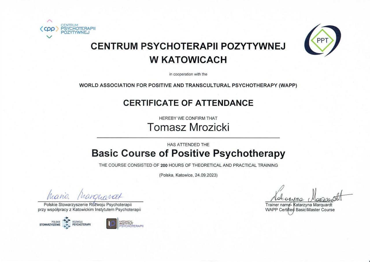 Jestem w trakcie pięcioletniego całościowego kursu psychoterapii w Katowickim Instytucie Psychoterapii, akredytowanego przez Polskie Towarzystwo Psychologiczne. Ukończyłem również podstawowy kurs psychoterapii pozytywnej oraz uczestniczę w całościowym szkoleniu z hipnozy terapeutycznej, organizowanym przez Małopolski Instytut Genomiki Psychospołecznej i Badań nad Świadomością wraz z Polskim Stowarzyszeniem Rozwoju Psychoterapii.