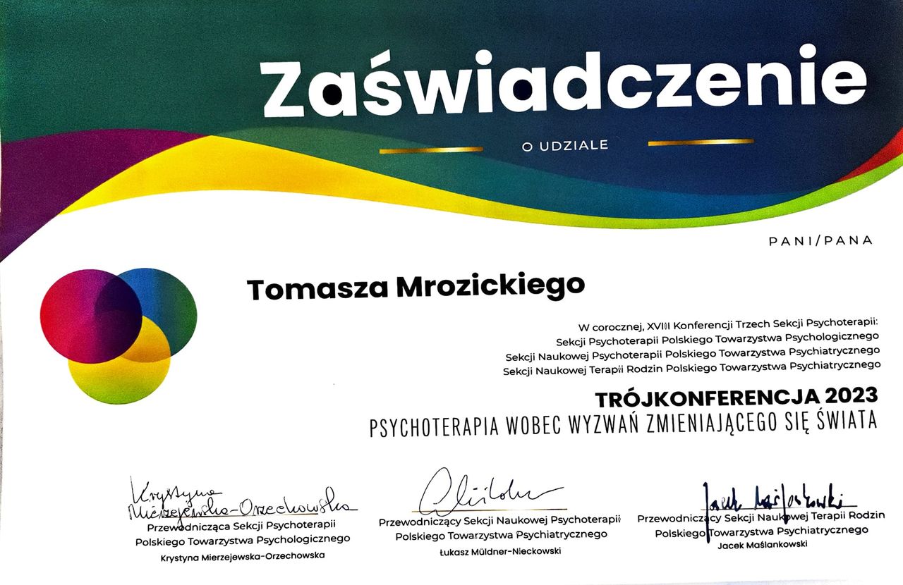 Jesteśmy w trakcie terapii rodzinnej u Pana Tomasza z naszymi nastoletnimi dziećmi. To wszystko jeszcze trwa, ale już widzimy, że lepiej się dogadujemy. Pan Tomasz ma w sobie spokój i potrafi tak poprowadzić rozmowę, że czujemy się bezpiecznie. Jego uwagi naprawdę nam pomagają ogarniać to, z czym sobie nie radziliśmy. Jesteśmy mu za to bardzo wdzięczni.