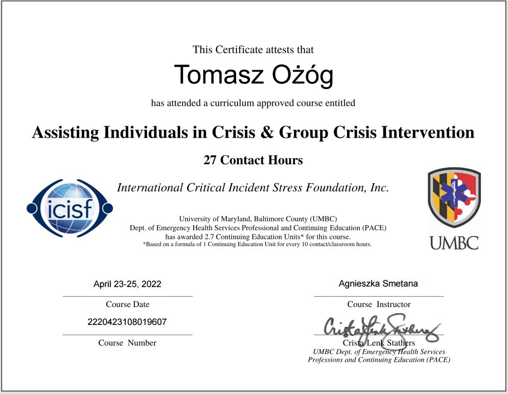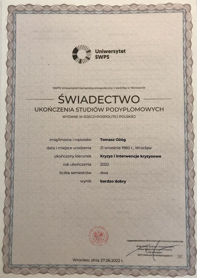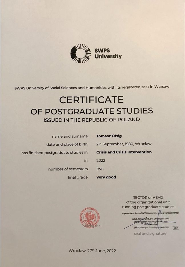 Jestem psychoterapeutą psychoanalitycznym w trakcie szkolenia oraz Członkiem Nadzwyczajnym Polskiego Towarzystwa Psychoterapii Psychoanalitycznej (PTPP) i uczestnikiem zaawansowanego szkolenia z psychoterapii psychoanalitycznej, prowadzonego przez Psychoanalityczną Szkołę Psychoterapii w Poznaniu. Ukończyłem również studia podyplomowe z zakresu Interwencji Kryzysowej i Psychologii Kryzysu na Uniwersytecie SWPS, uzyskując certyfikat Assisting Individuals in Crisis and Group Crisis Intervention nadany przez ICISF.
