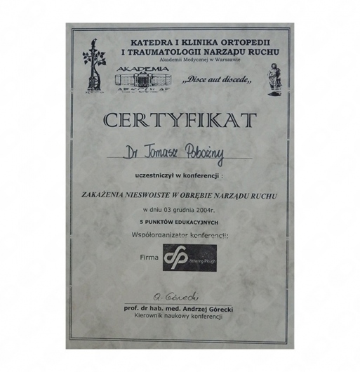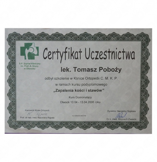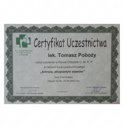 Przez kilkanaście lat szkoliłem się w swojej dziedzinie i nadal cały czas to czynię w wielu ośrodkach krajowych i zagranicznych, z których wymienić należy tak renomowane kliniki i ośrodki, jak: Klinika Ortopedii i Traumatologii Narządu Ruchu w Szpitalu CMKP im. prof. A. Grucy w Otwocku, Klinika Ortopedii w Stolzalpe w Austrii, Klinika prof. Hubego w Monachium. Swoją wiedzę w zakresie przeprowadzania alloplastyki stawu kolanowego i biodrowego rozwijałem w Oxfordzie i w Stanach Zjednoczonych, u wybitnych specjalistów w tym zakresie: Adolpho Lombardiego, Harrego Schmaltz’a czy Keith’a Berenda. Odbyłem także wiele szkoleń i kursów w zakresie zaawansowanej chirurgii artroskopowej, m.in. kurs rekonstrukcji łąkotki z wykorzystaniem implantów kolagenowych w Tübingen w Niemczech, kurs rekonstrukcji więzadeł stawu kolanowego w Porto (klinika prowadzona przez dr. Da Silvę), kurs chirurgii artroskopowej stawu ramiennego i endoprotezoplastyki stawu ramiennego w Annecy we Francji (u doktora Lafosse).