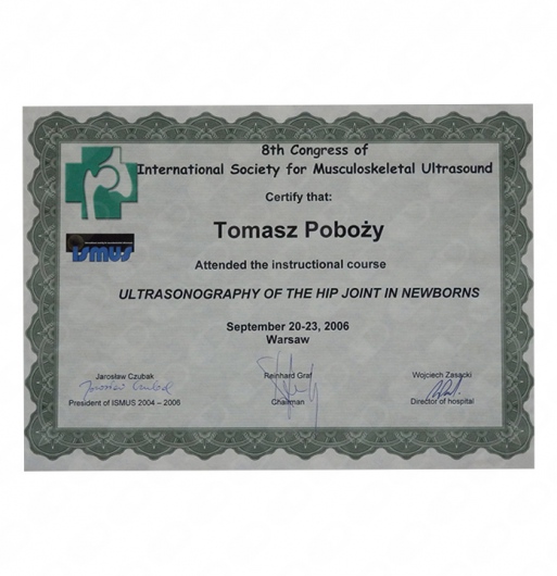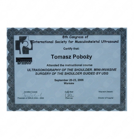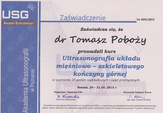 Od ponad 15 lat moją pasją jest diagnozowanie schorzeń w obrębie stawów, z wykorzystaniem techniki ultrasonograficznej (USG). Jestem ekspertem w wykonywaniu i analizie wyników badań USG narządu ruchu. Od 2003 roku wykonałem kilkadziesiąt tysięcy takich badań, z wykorzystaniem różnego typu ultrasonografów. Swoją wiedzą w dziedzinie USG ortopedycznego od lat dzielę się z innymi lekarzami, prowadząc dla nich indywidualne szkolenia. Jestem również kierownikiem naukowym kursów z zakresu ultrasonografii układu mięśniowo-szkieletowego w znanych ośrodkach szkoleniowych, takich jak: CEMED w Warszawie, MSP Pakt w Katowicach, Akademia Ultrasonografii w Poznaniu. Ponadto, jestem recenzentem artykułów naukowych w czasopiśmie Journal of Ultrasonography.