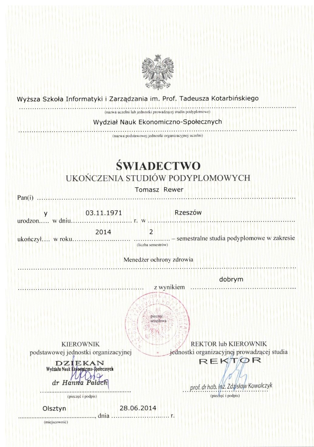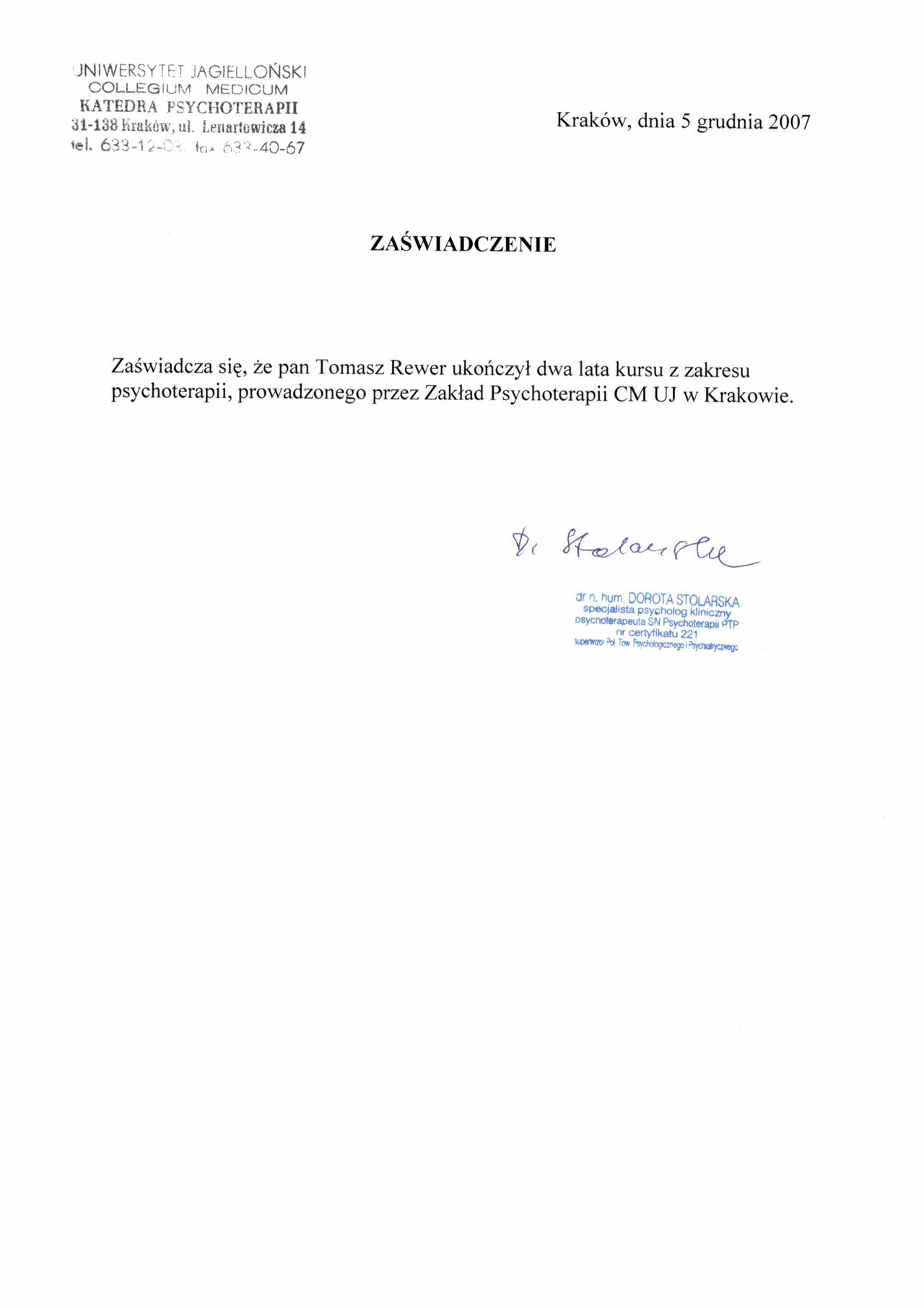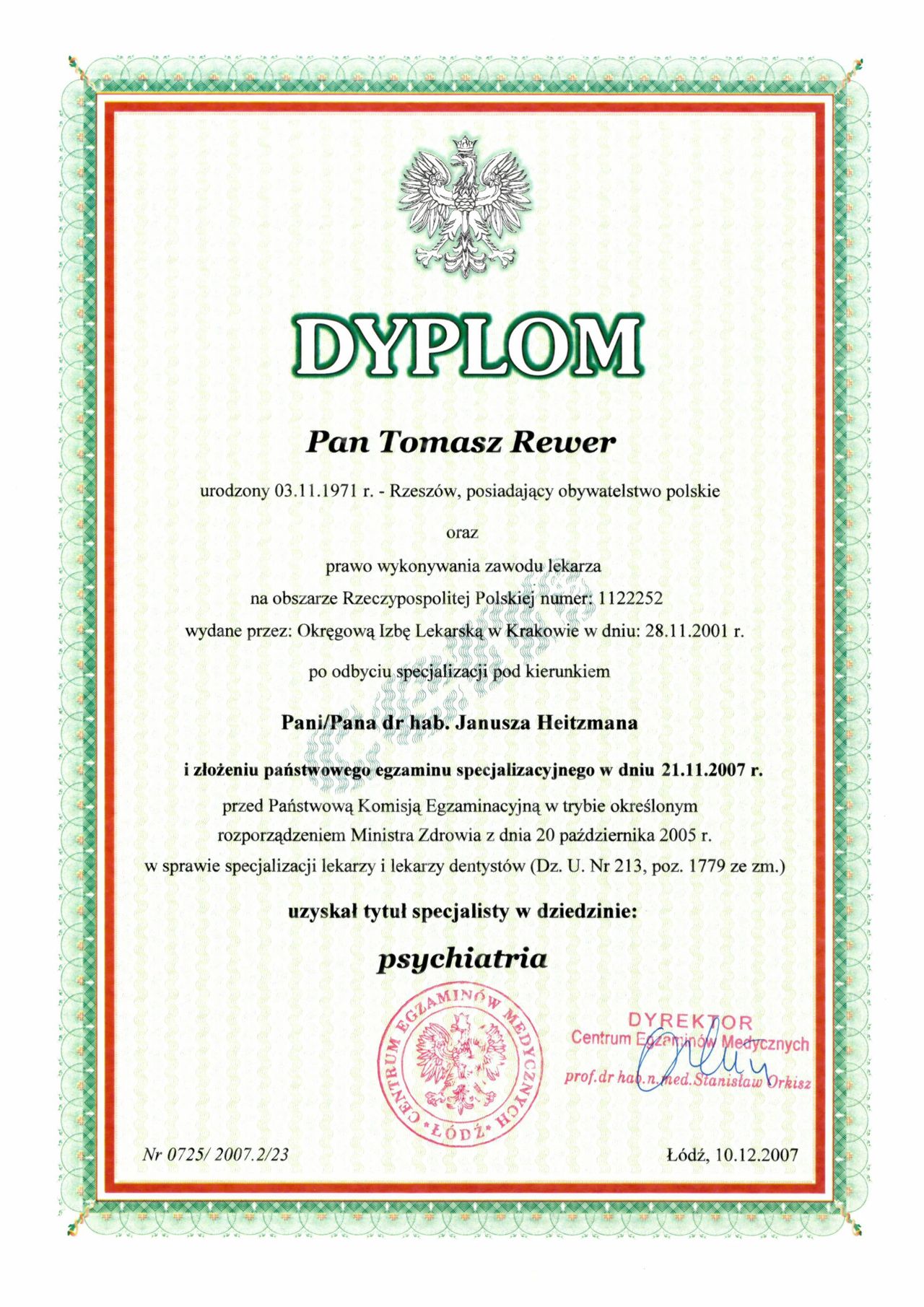 Jestem psychiatrą specjalizującym się w psychiatrii dorosłych, ukończyłem dwa lata szkolenia w zakresie psychoterapii w Zakładzie Psychoterapii CM UJ oraz studia podyplomowe w zakresie zarządzania w ochronie zdrowia w 2014 r. "Menedżer ochrony zdrowia".