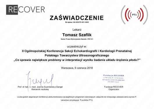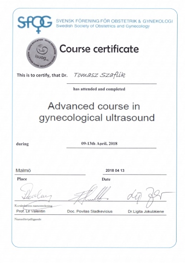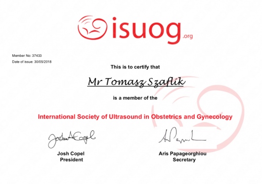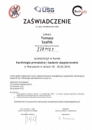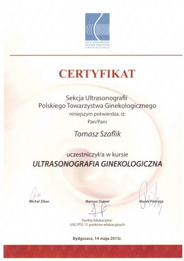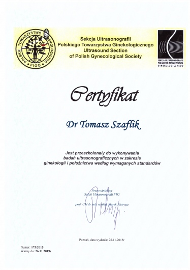 Posiada Certyfikat Sekcji USG PTG w zakresie wykonywania badań ultrasonograficznych w Położnictwie i Ginekologii.