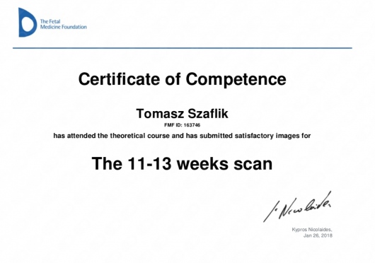 Posiada Certyfikat FMF (Fetal Medicine Foundation) pozwalający na wykonywanie badań ultrasonograficznych 1. trymestru (tzw. "genetycznych").