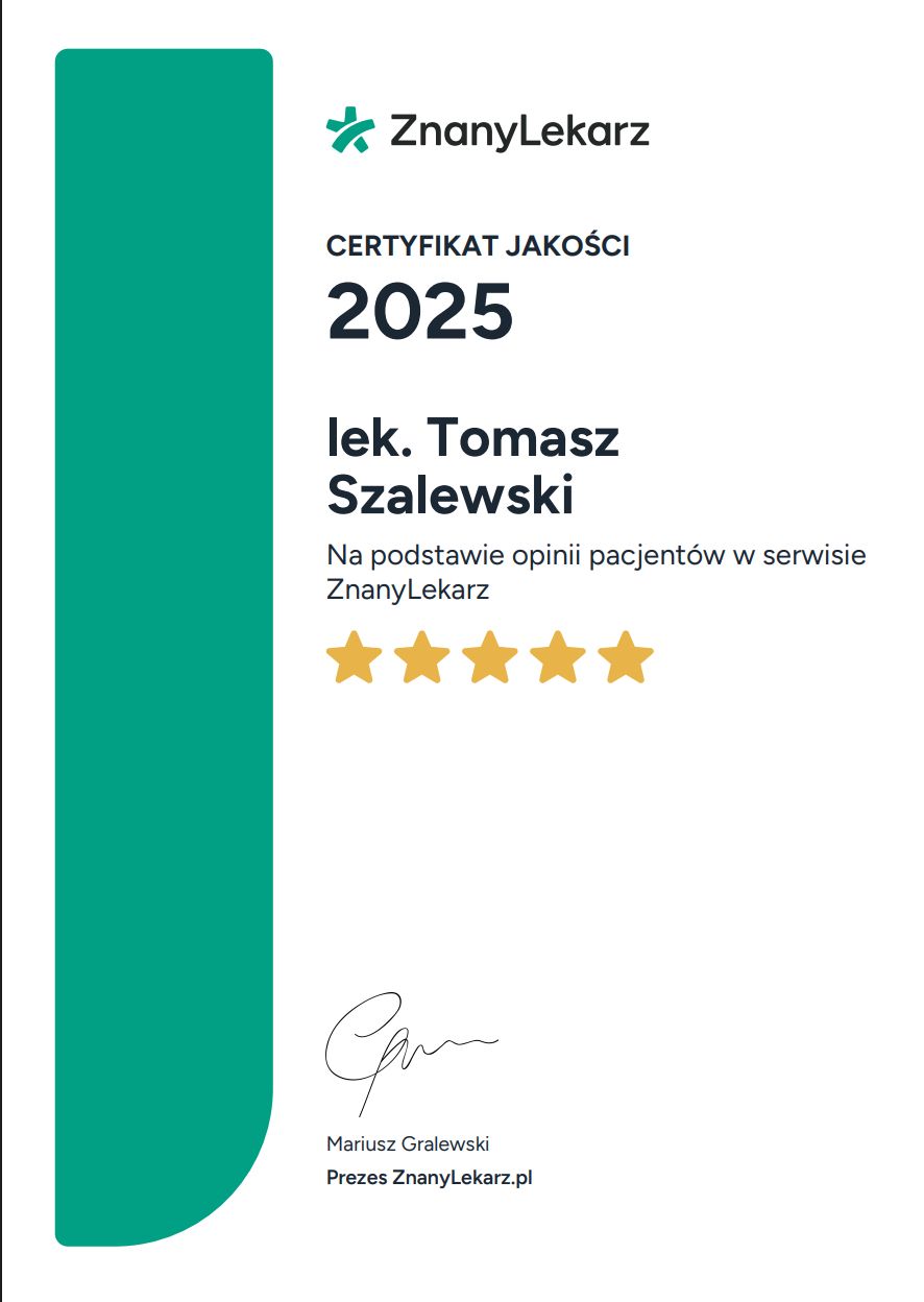 Czy Tomasz Szalewski przyjmuje online, bez konieczności pojawiania się w placówce?Tak, Tomasz Szalewski oferuje konsultacje online. Wybierz opcję „konsultacja online” przy umawianiu wizyty, a zobaczysz dostępne terminy.
