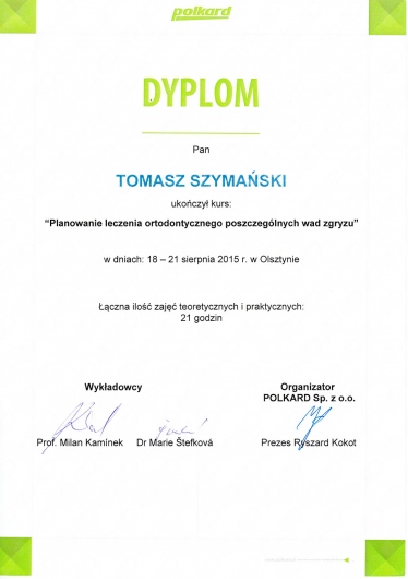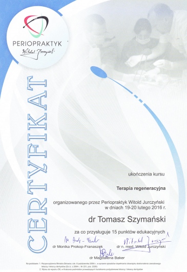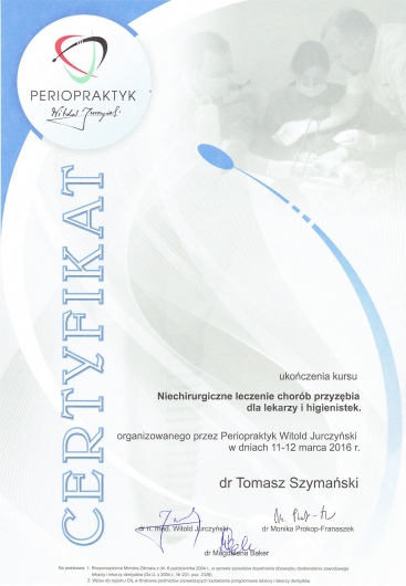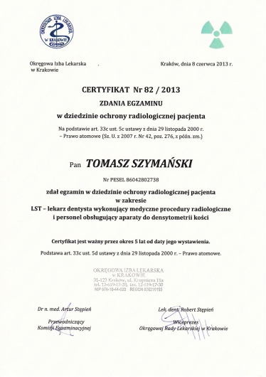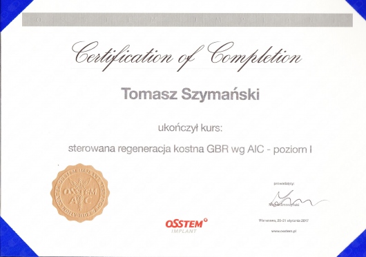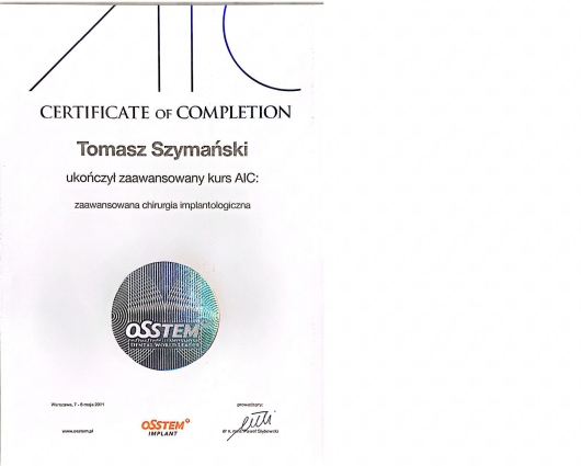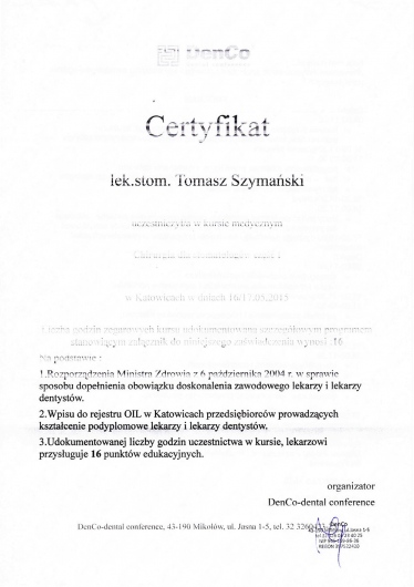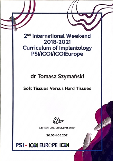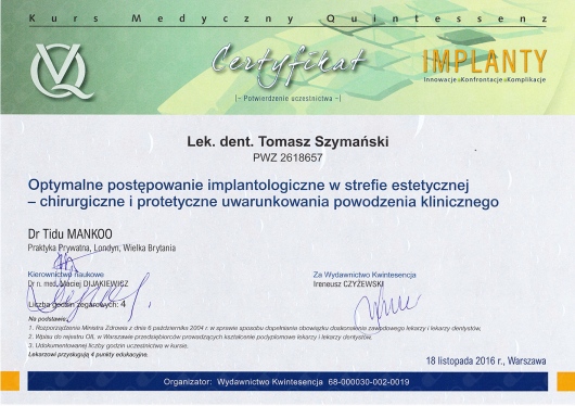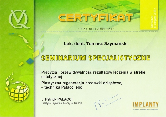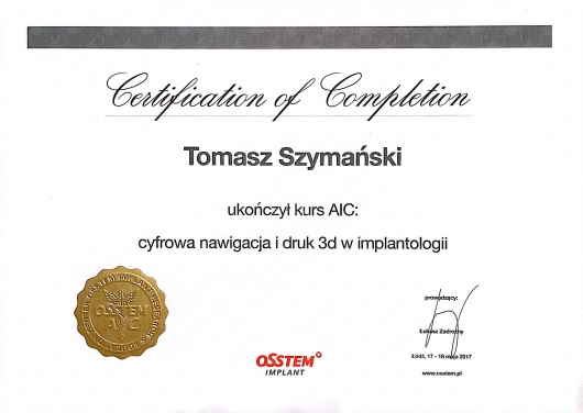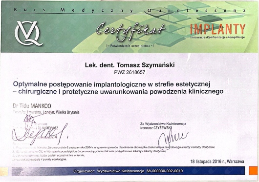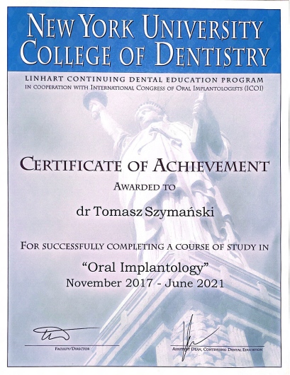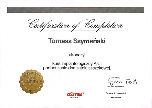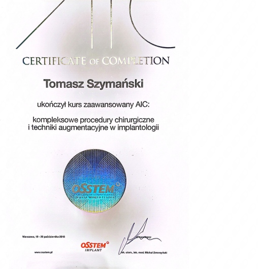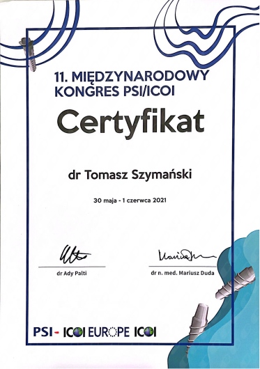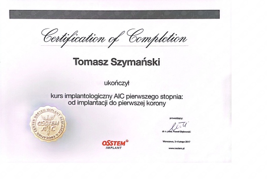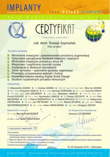 Szczególnym zamiłowaniem darzę chirurgię stomatologiczną i implantologię. Jestem członkiem Polskiego Stowarzyszenia Implantologicznego i uczestnikiem licznych kongresów implantologicznych. Dzięki temu zabiegi takie jak: chirurgiczne ekstrakcje ósemek , wszczepianie implantów, odbudowa brakującej kości przed wszczepieniem implantu, chirurgia plastyczna dziąseł czy implanto-protetyka nie stanowią dla mnie problemu. W dziedzinie implantologii przeszedłem wiele szkoleń zapewniających  mi najnowocześniejszą wiedzę i praktyczne doświadczenie we wszczepianiu implantów w miejscu utraconych zębów. Leczenie planuję kompleksowo. Oprócz samych implantów biorę pod uwagę również odbudowę protetyczną oraz dziąsła, tak żeby całość tworzyła estetyczną harmonię.