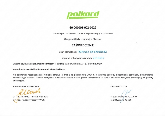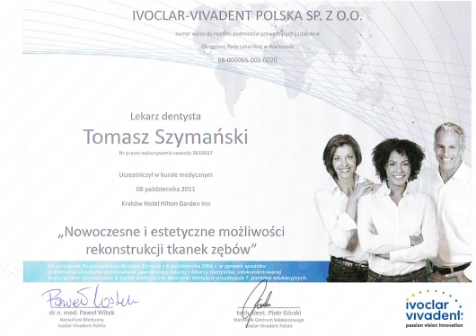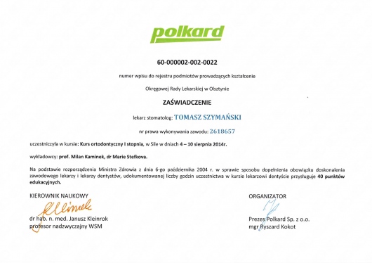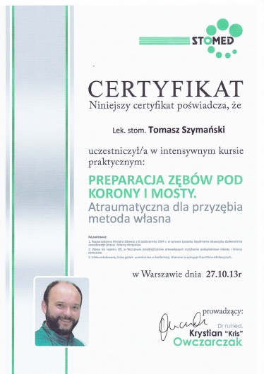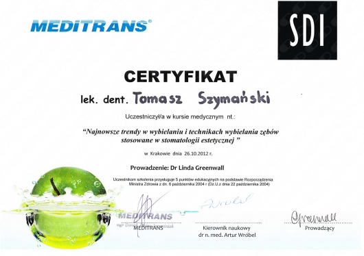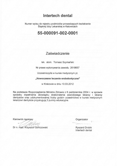 Jestem stomatologiem z wieloletnim doświadczeniem w dziedzinie implantologii, chirurgii stomatologicznej, periodontologii oraz stomatologii zachowawczej. Od ponad 10 lat większość zabiegów wykonuję przy użyciu mikroskopu operacyjnego, w tym leczenie zachowawcze i kanałowe, co w połączeniu z wrodzoną skrupulatnością i przywiązywaniem wagi do najmniejszego szczegółu pozwala mi uzyskiwać doskonałość w wykonywanych zabiegach.