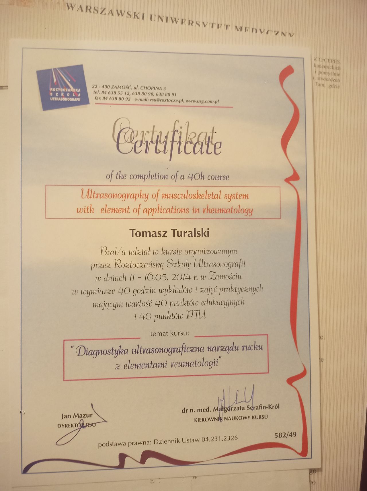 Jaki jest zakres porad oferowanych przez Tomasz Turalski?Tomasz Turalski to ortopeda. Na podstawie swojego doświadczenia i wykształcenia Tomasz Turalski oferuje usługi takie jak: USG narządu ruchu, konsultacja ortopedyczna, konsultacja ortopedyczna dzieci, blokada stawu, blokada kręgosłupa, USG ortopedyczne, Kwas hialuronowy.